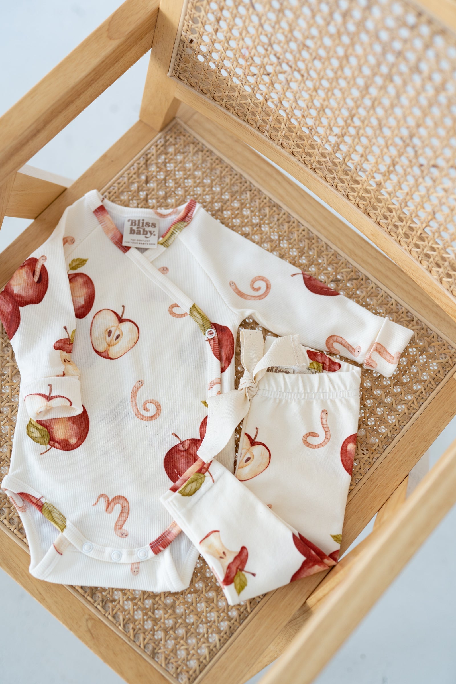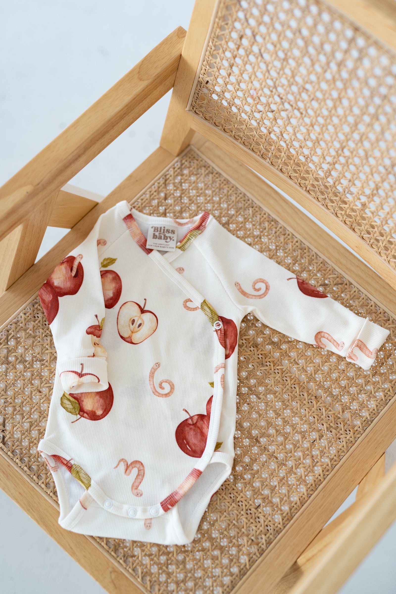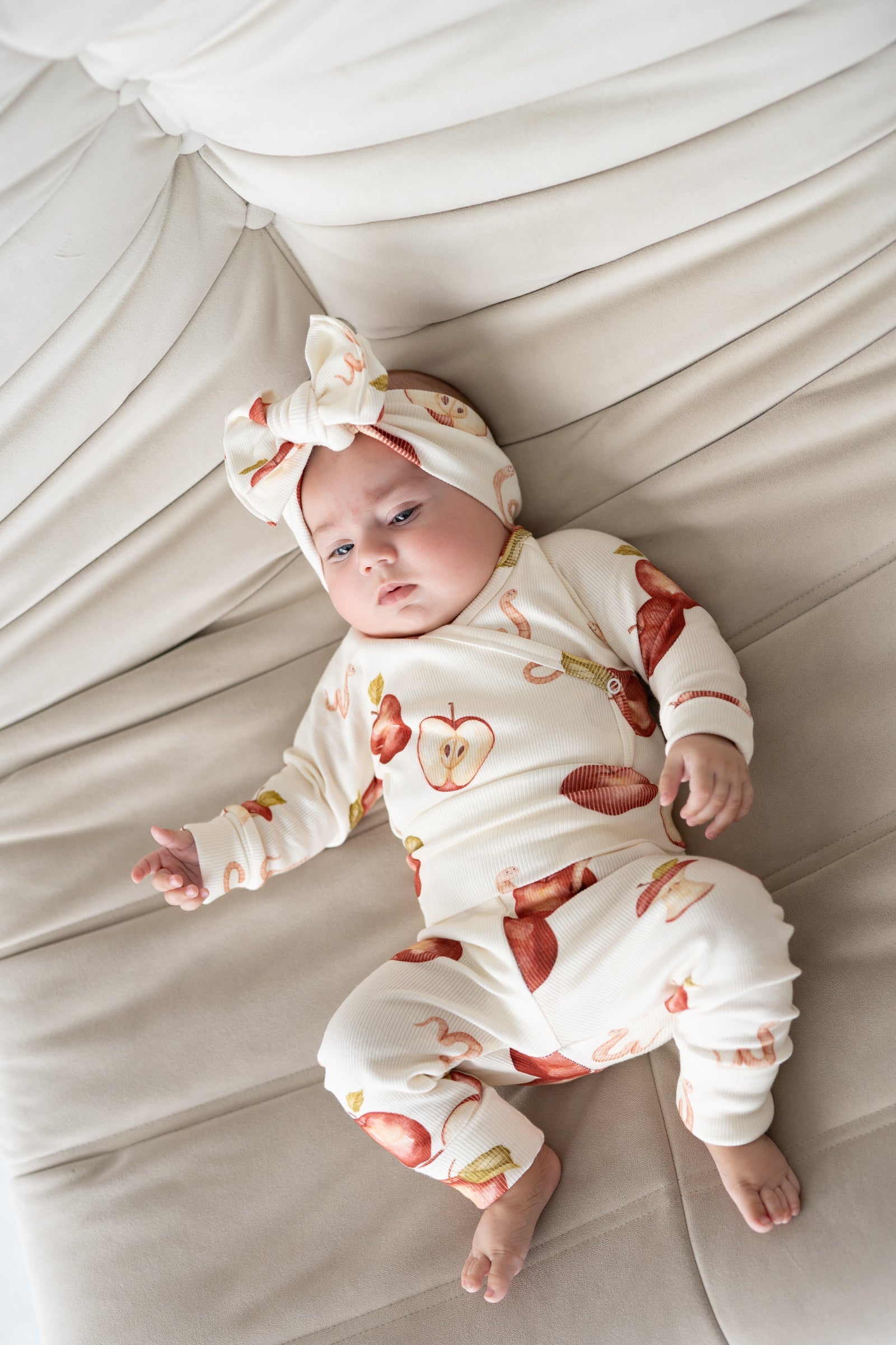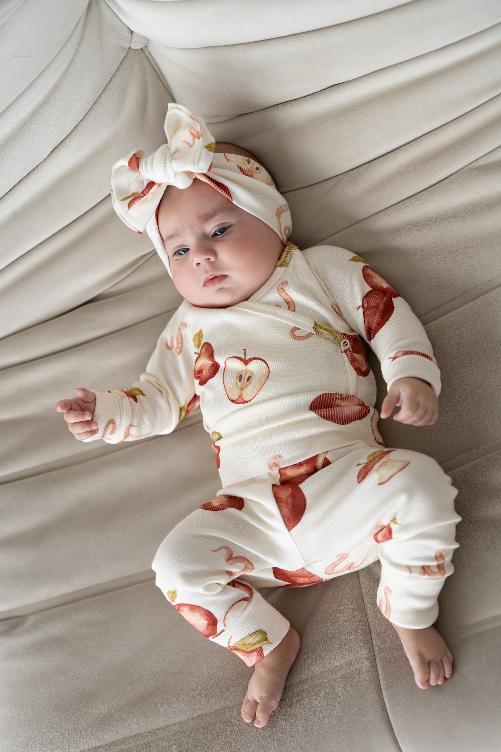 Mitwachsender Umschlagbody aus weicher, elastischer Baumwolle mit Rippenstruktur für Komfort und Bewegungsfreiheit. Dank des doppelten Verschlusssystems im Schritt passt sich der Body der wachsenden Figur des Kindes an und ermöglicht so ein längeres Tragen.