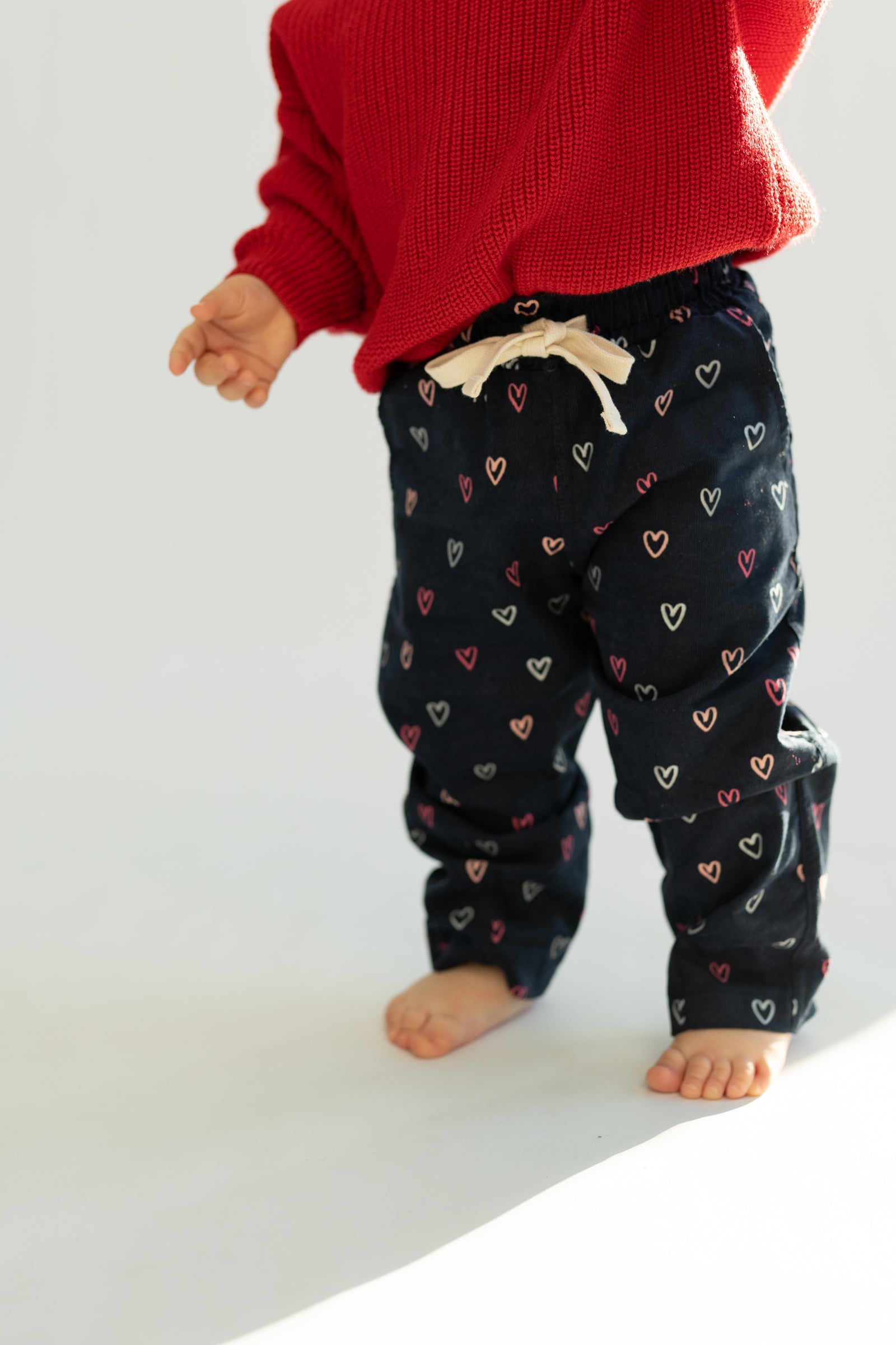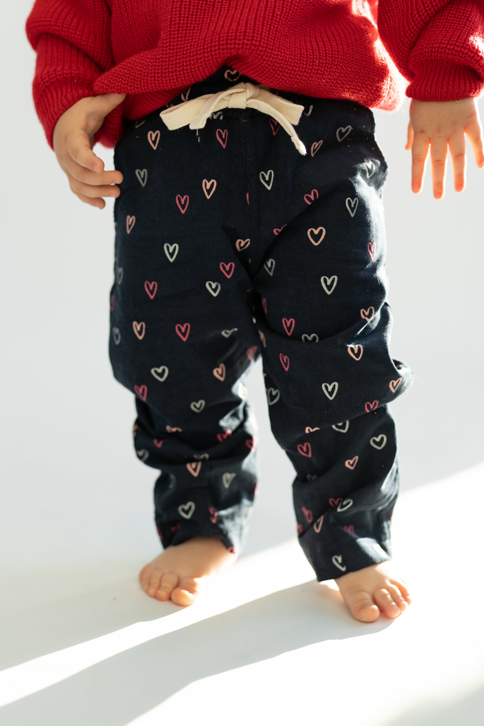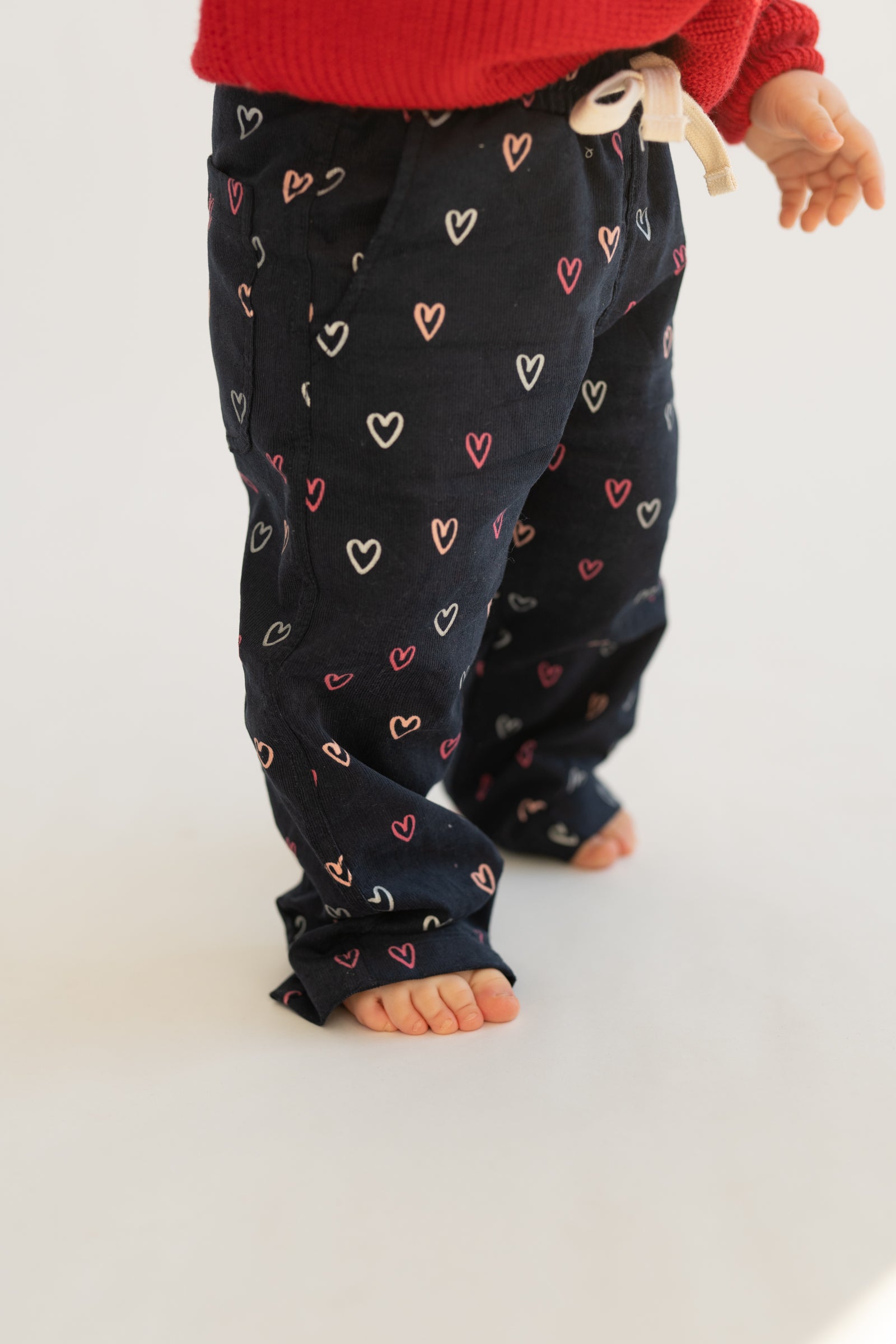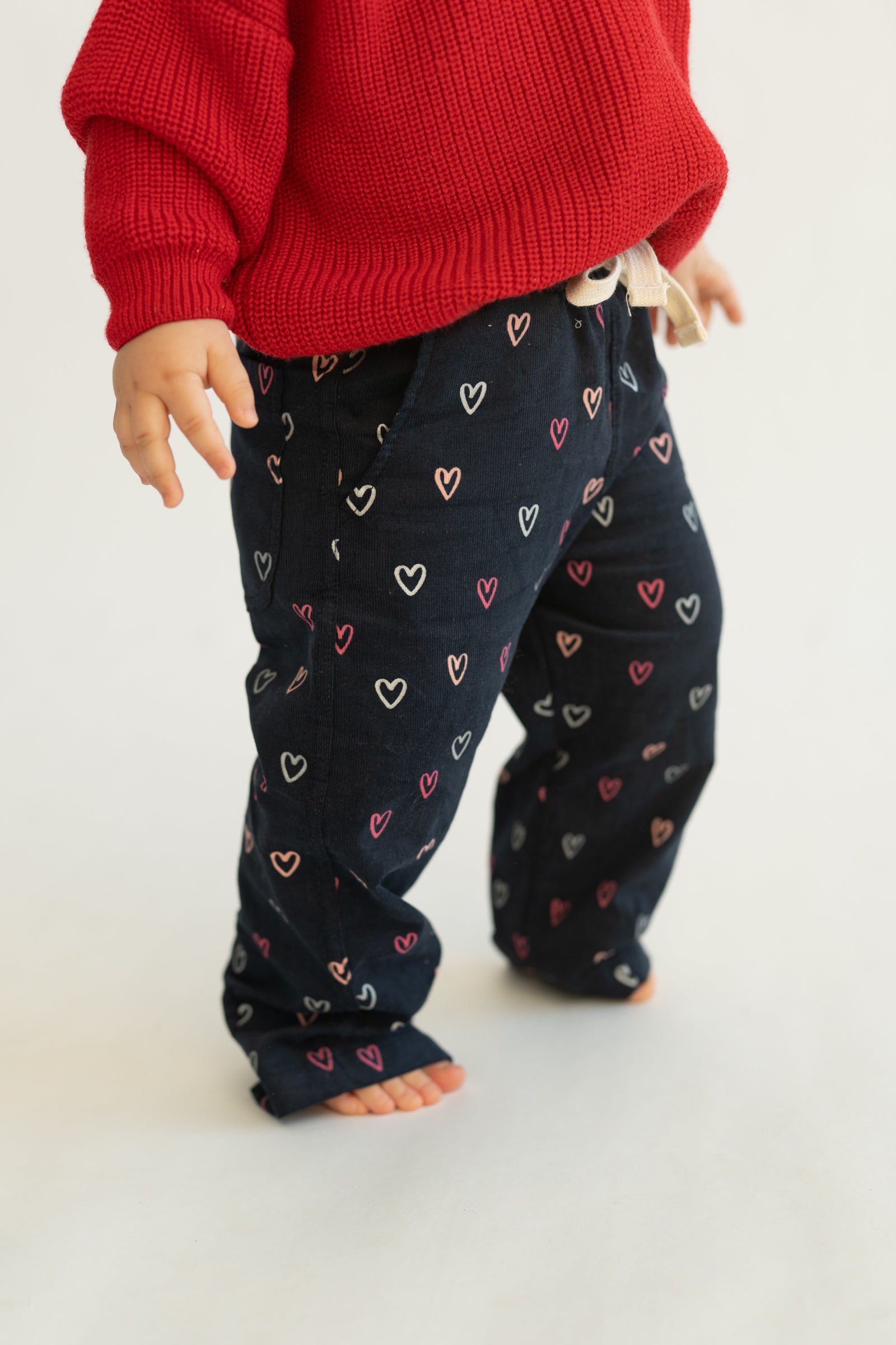Wygodne spodnie dziecięce w kroju baggy, stworzone z myślą o swobodzie ruchów i codziennym komforcie. Model posiada lekko zwężaną nogawkę ku dołowi, dzięki czemu spodnie dobrze układają się na nogach i zachowują nowoczesną formę. Granatowa baza ozdobiona drobnym wzorem serduszek w odcieniach różu i bieli nadaje całości subtelnie dziewczęcego, a jednocześnie uniwersalnego charakteru.