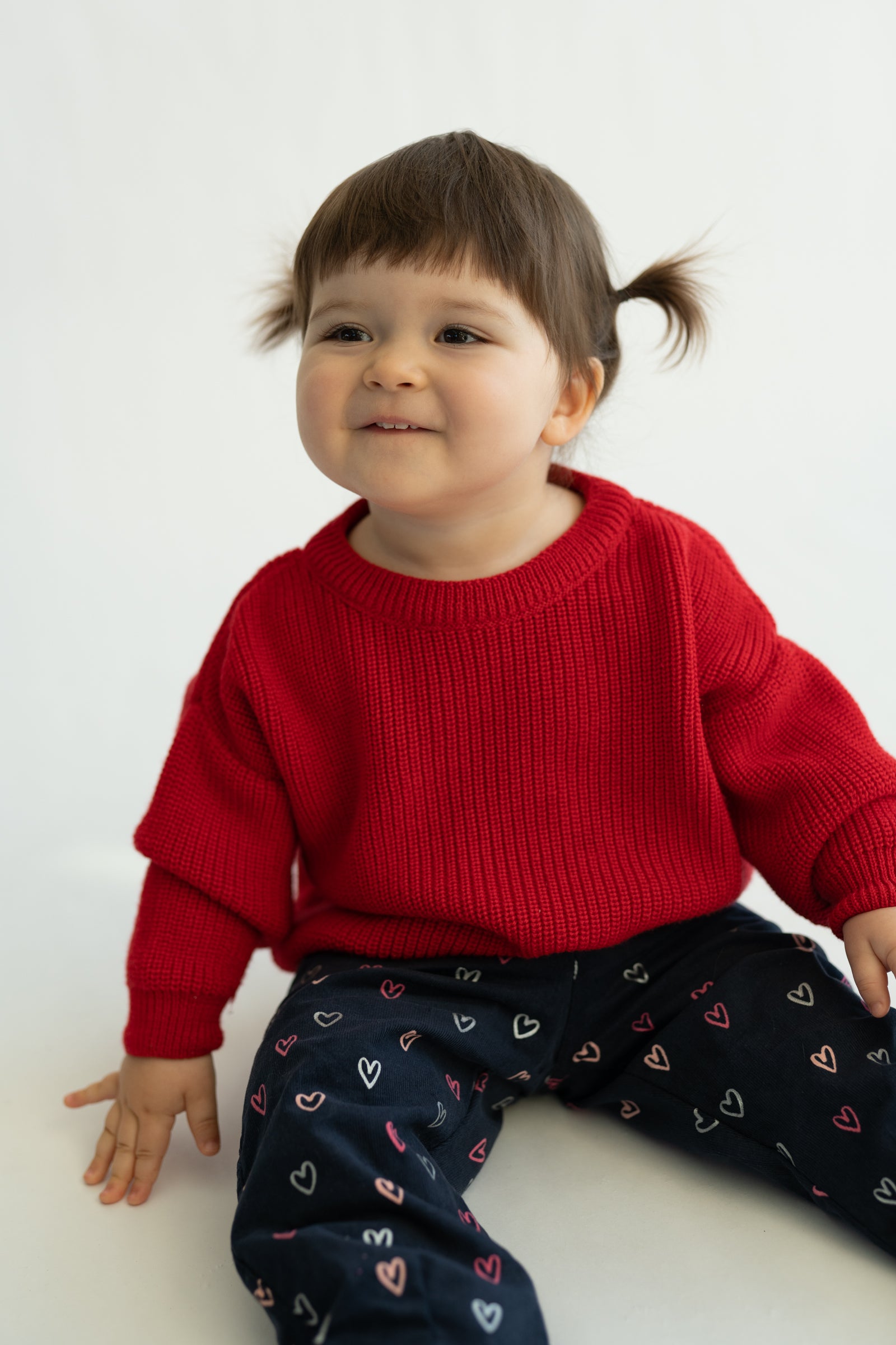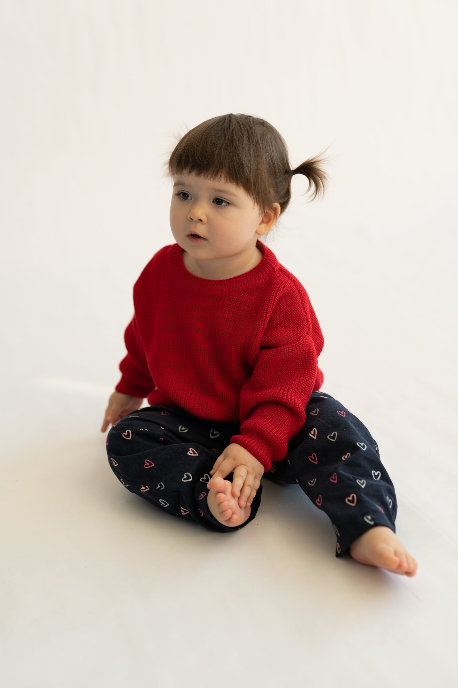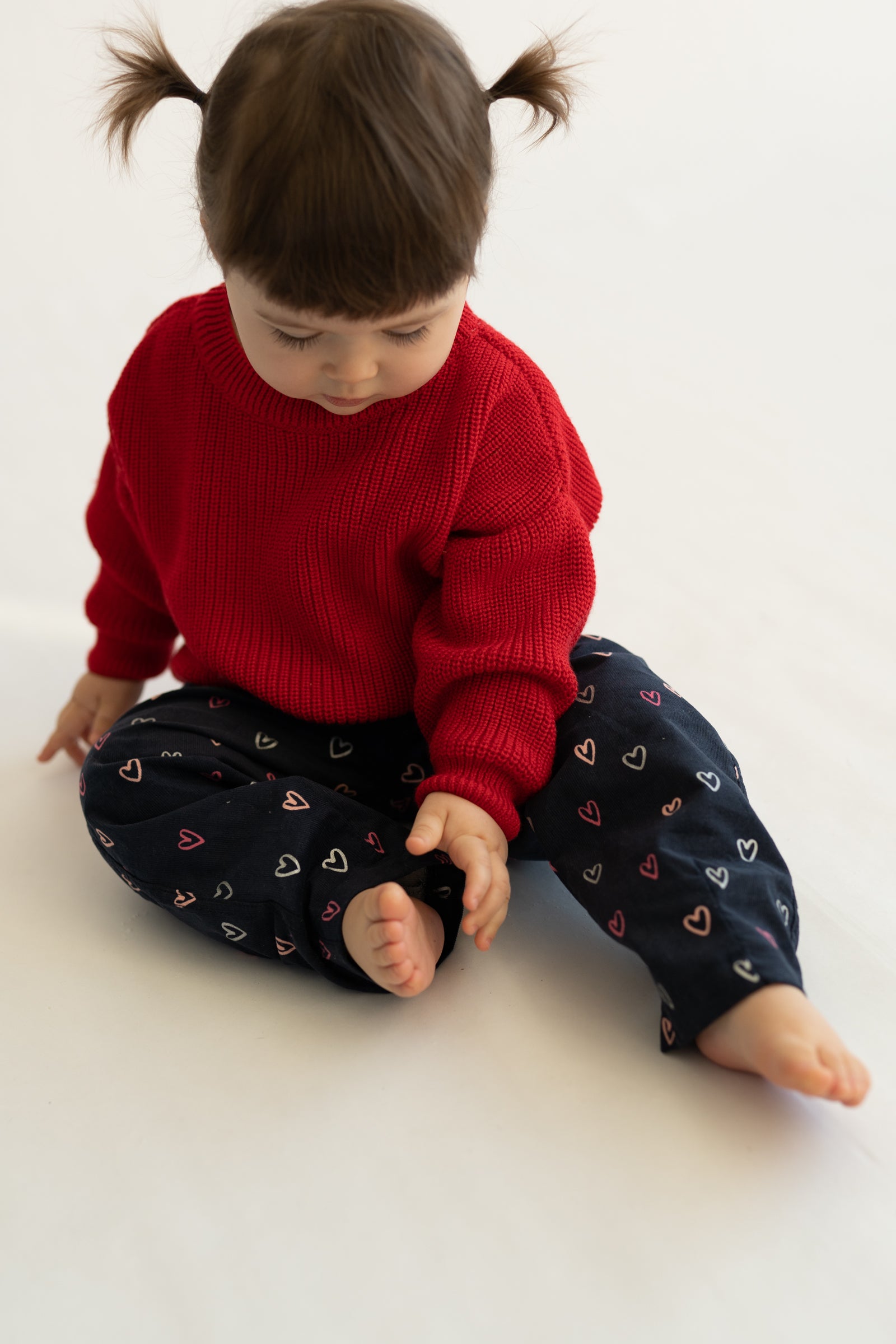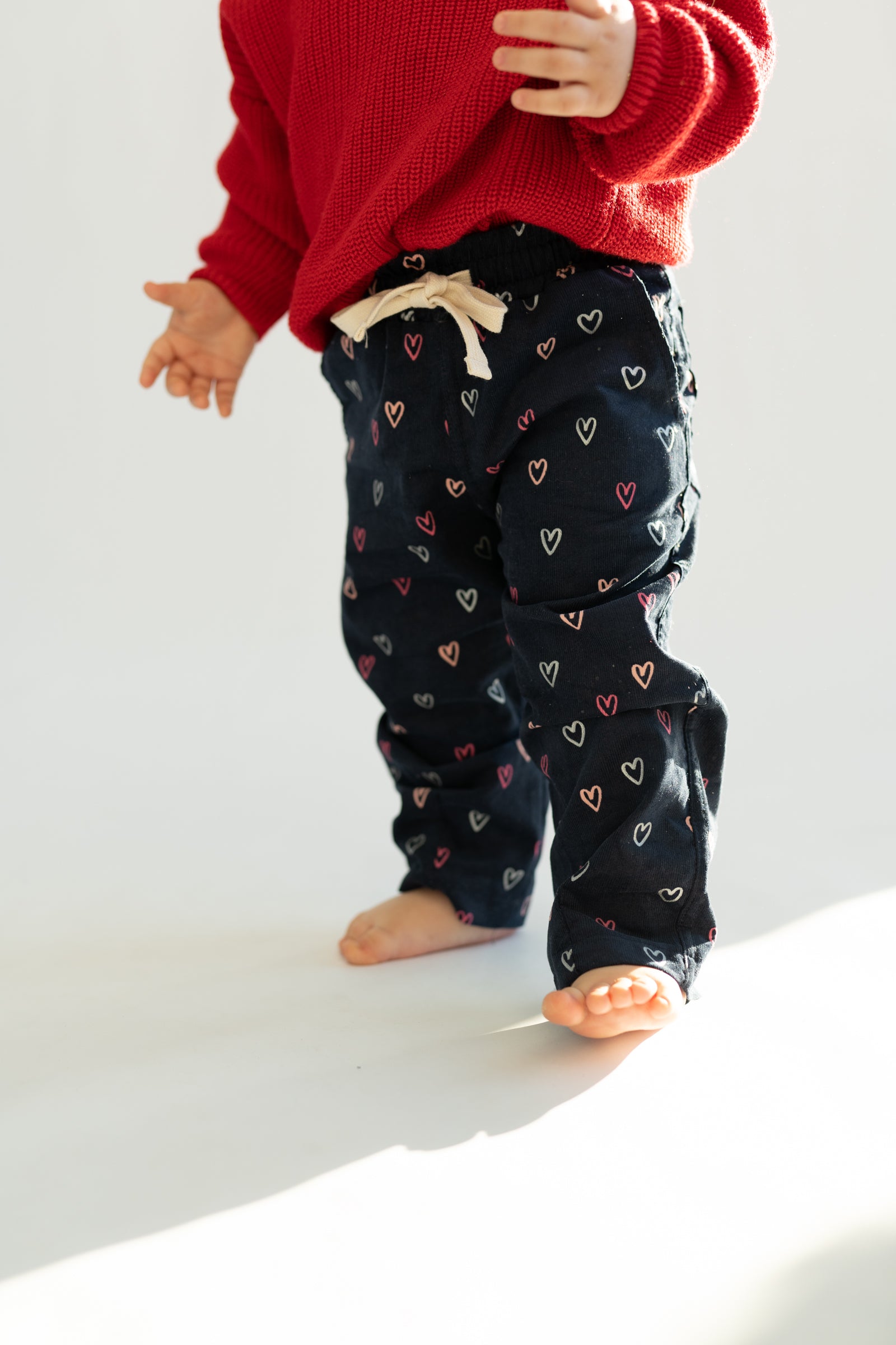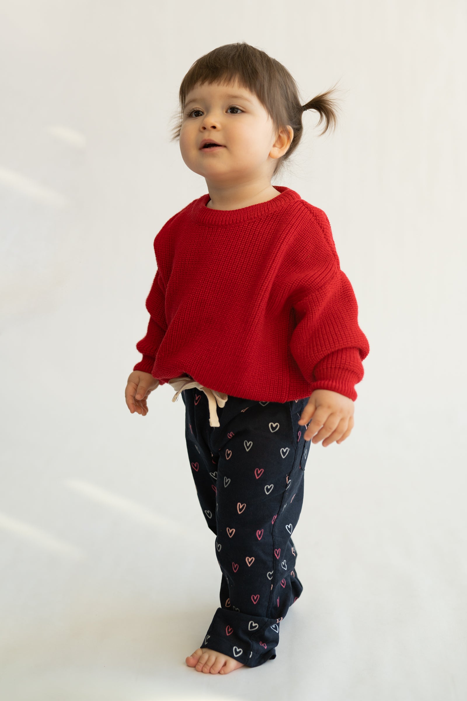 Wygodne spodnie dziecięce w kroju baggy, stworzone z myślą o swobodzie ruchów i codziennym komforcie. Model posiada lekko zwężaną nogawkę ku dołowi, dzięki czemu spodnie dobrze układają się na nogach i zachowują nowoczesną formę. Granatowa baza ozdobiona drobnym wzorem serduszek w odcieniach różu i bieli nadaje całości subtelnie dziewczęcego, a jednocześnie uniwersalnego charakteru.