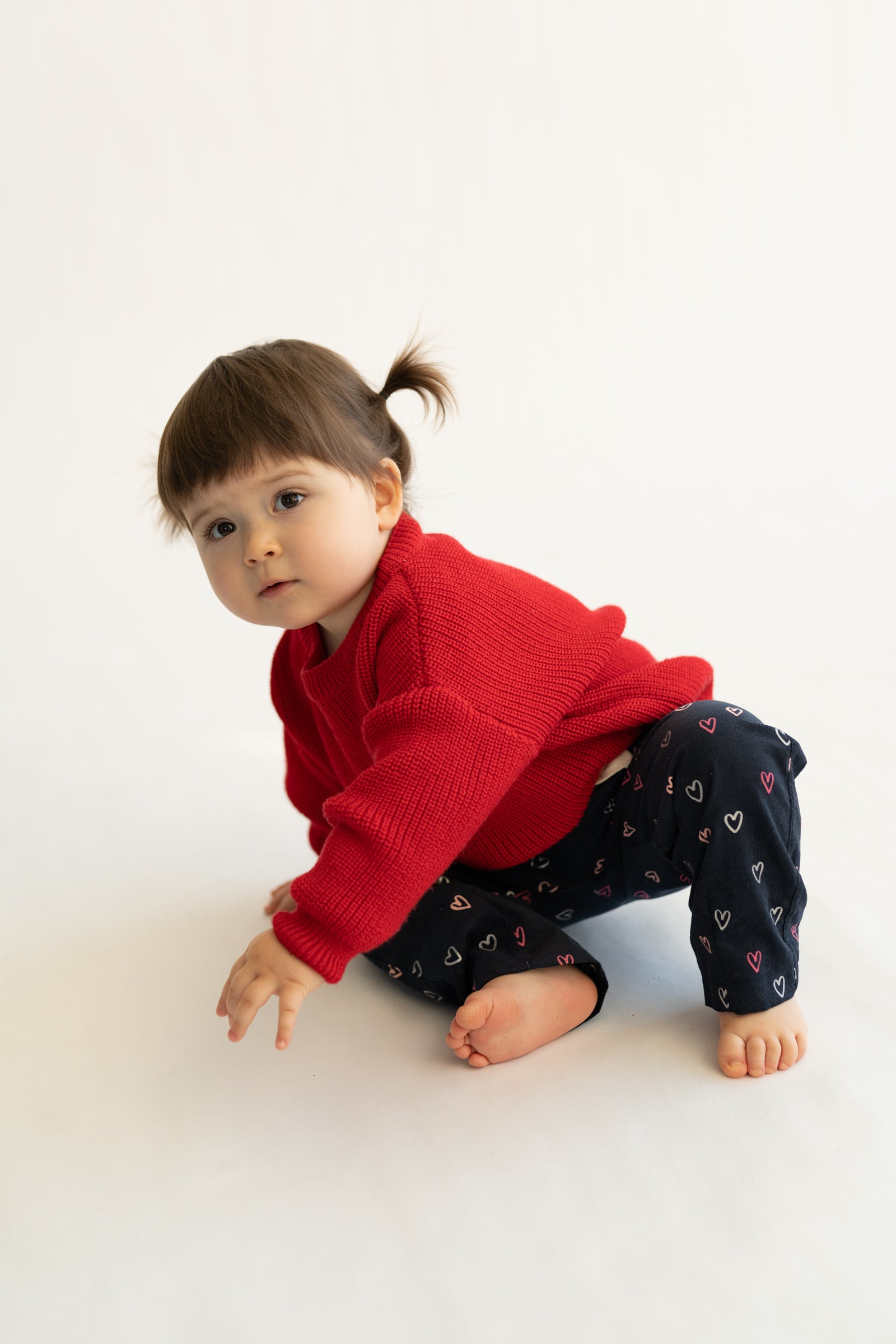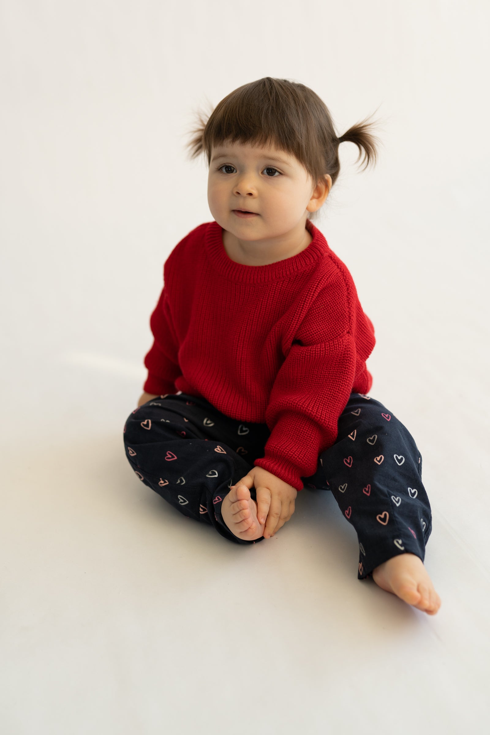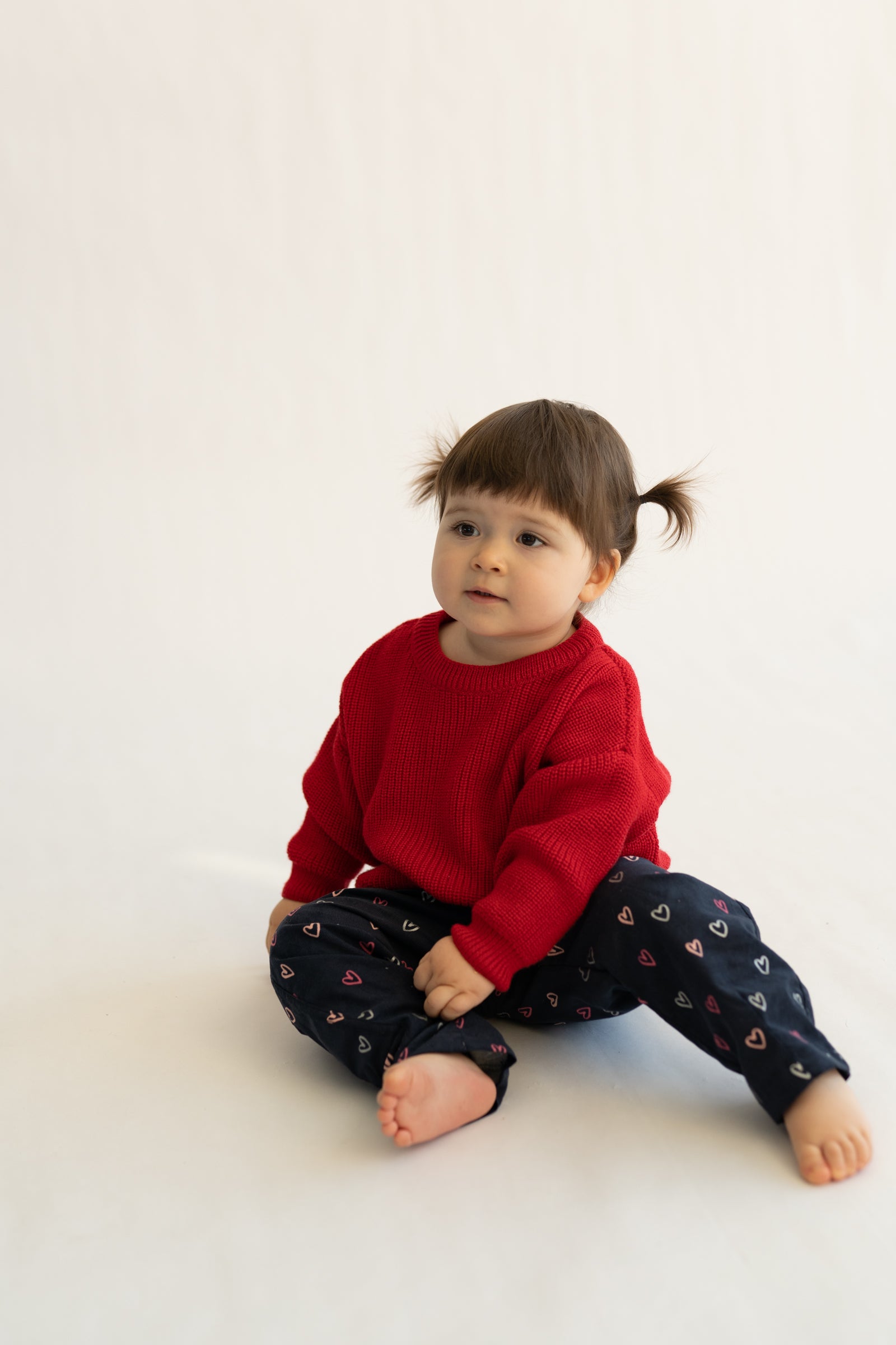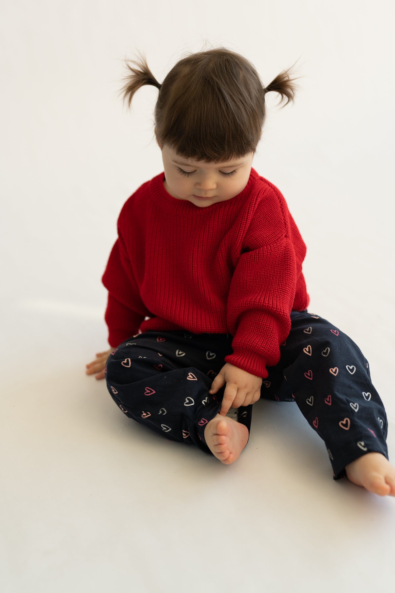 Wygodne spodnie dziecięce w kroju baggy, stworzone z myślą o swobodzie ruchów i codziennym komforcie. Model posiada lekko zwężaną nogawkę ku dołowi, dzięki czemu spodnie dobrze układają się na nogach i zachowują nowoczesną formę. Granatowa baza ozdobiona drobnym wzorem serduszek w odcieniach różu i bieli nadaje całości subtelnie dziewczęcego, a jednocześnie uniwersalnego charakteru.