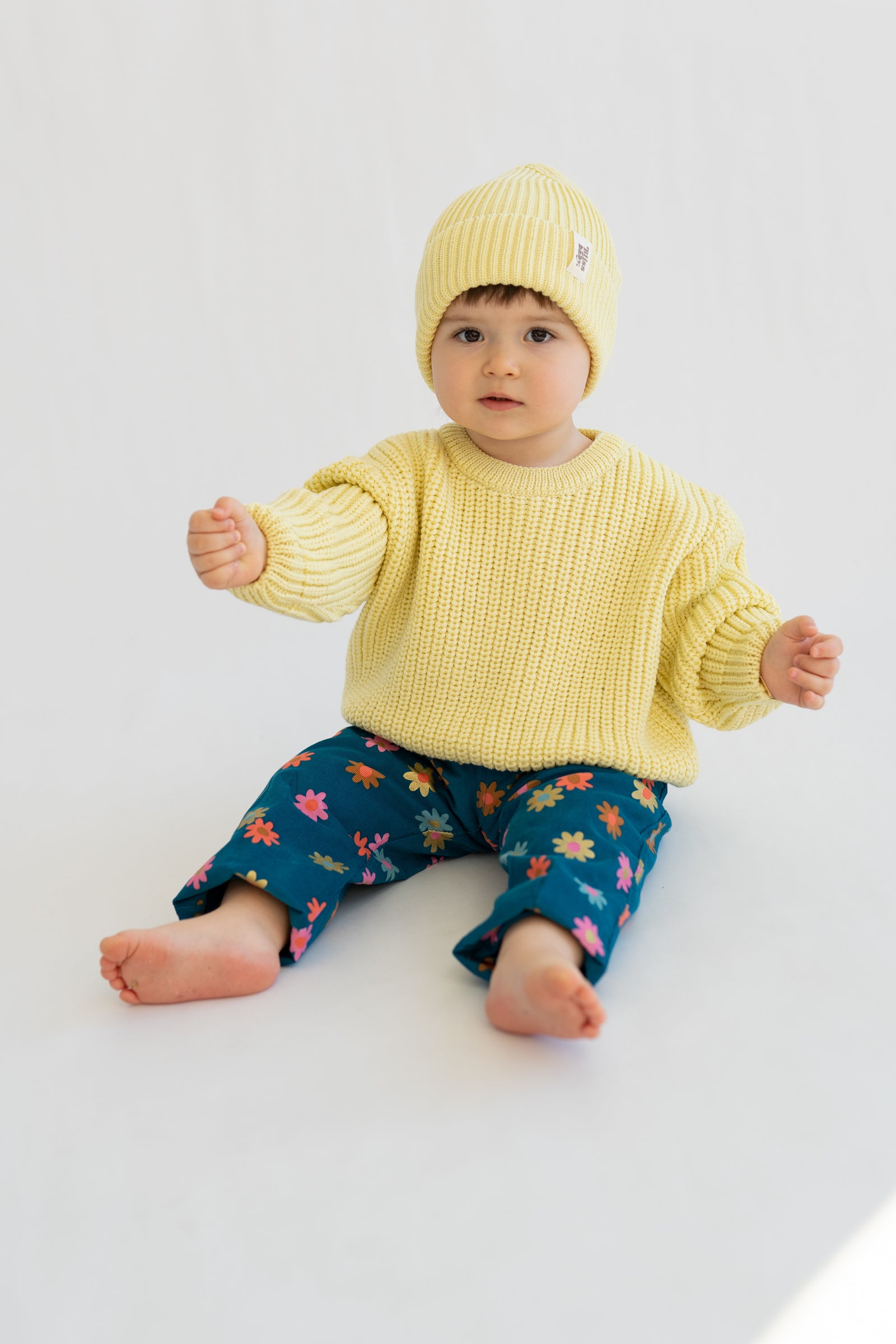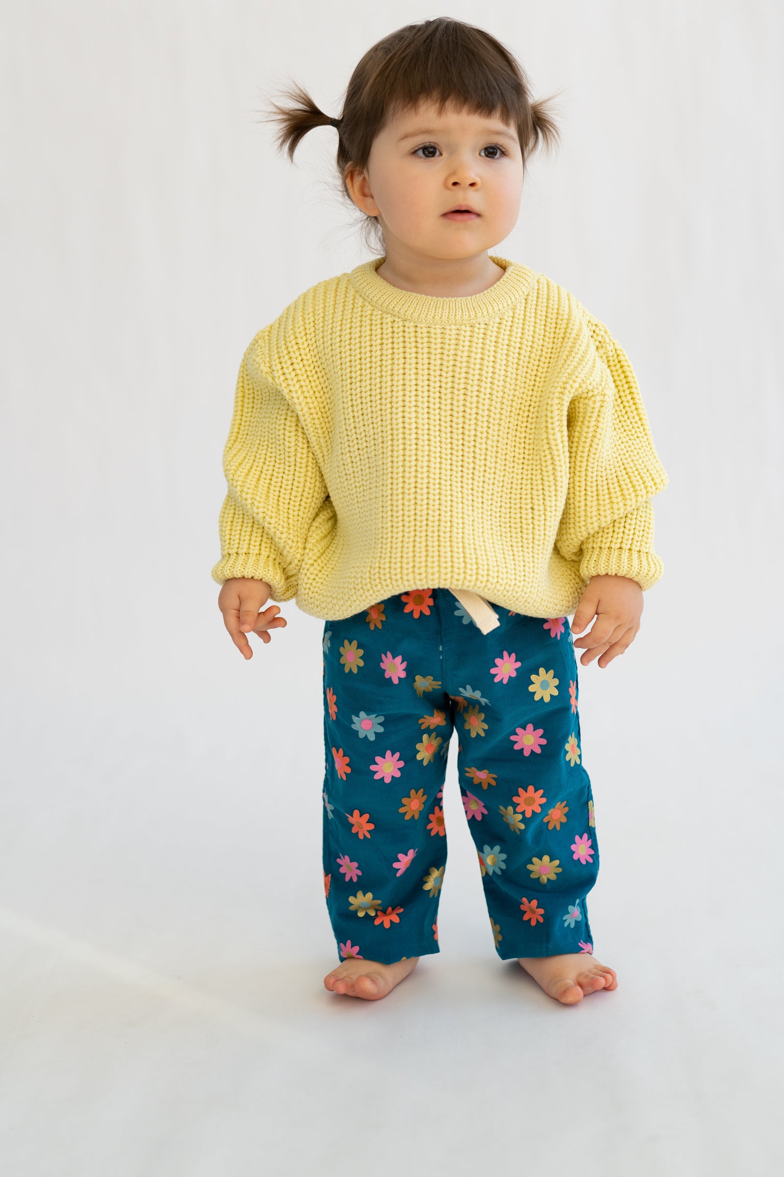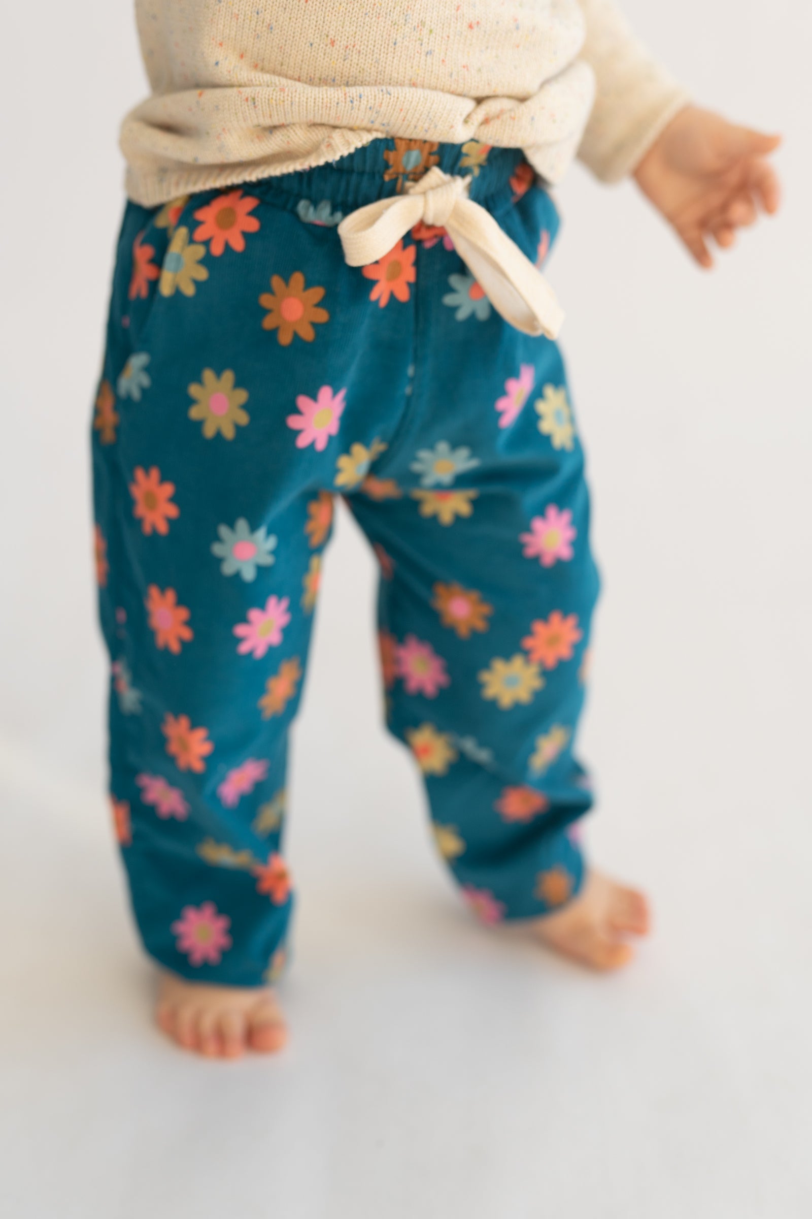Wygodne spodnie dziecięce w kroju baggy, zaprojektowane z myślą o swobodzie ruchów i codziennym komforcie malucha. Model posiada lekko zwężaną nogawkę ku dołowi, dzięki czemu spodnie dobrze układają się na nogach i nie ograniczają aktywności dziecka. Głęboki odcień teal w połączeniu z kolorowym, kwiatowym wzorem nadaje całości radosnego, a jednocześnie harmonijnego charakteru.