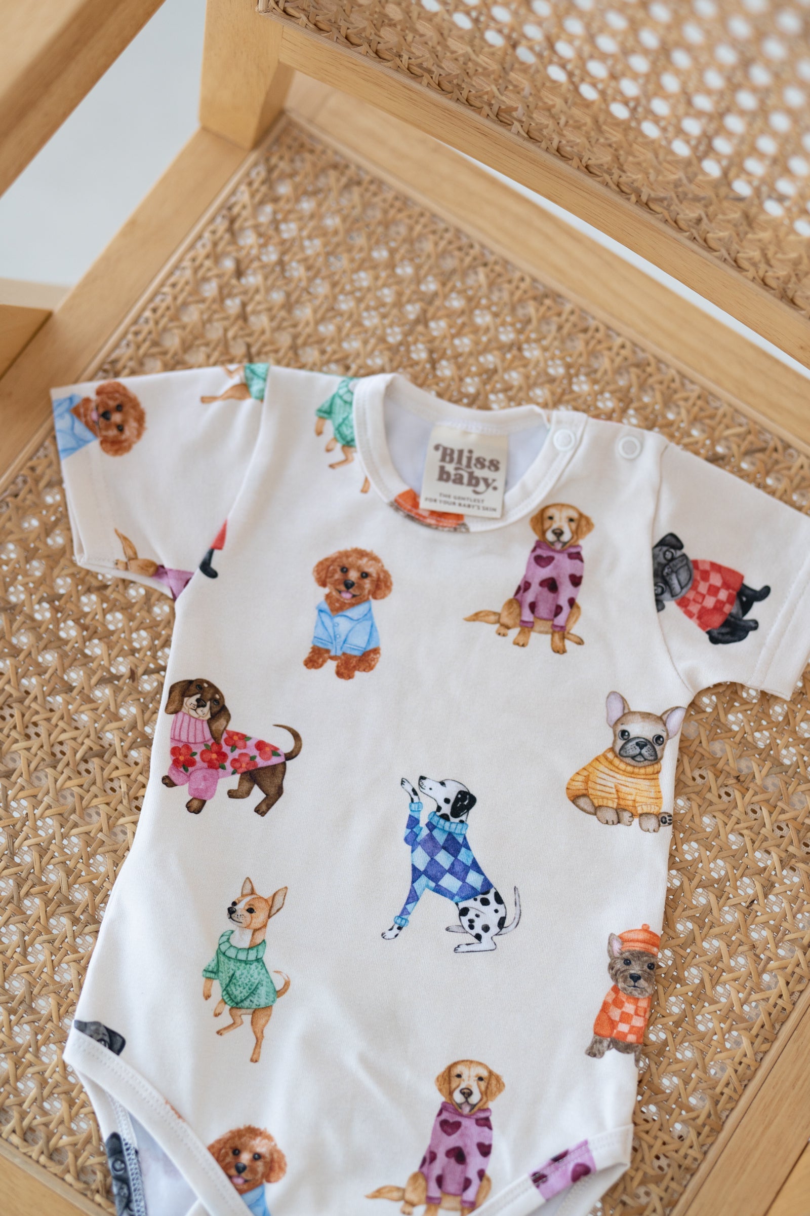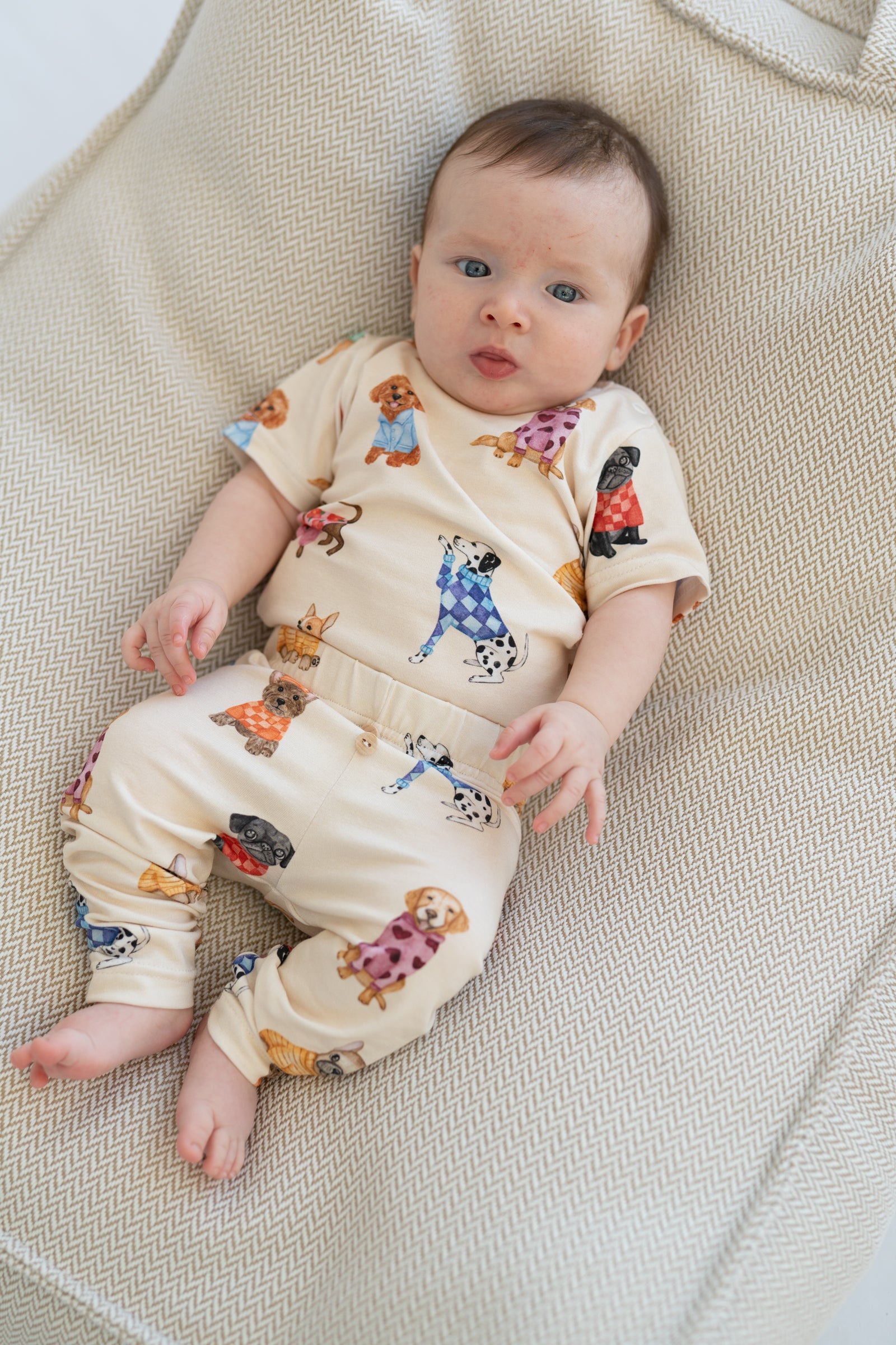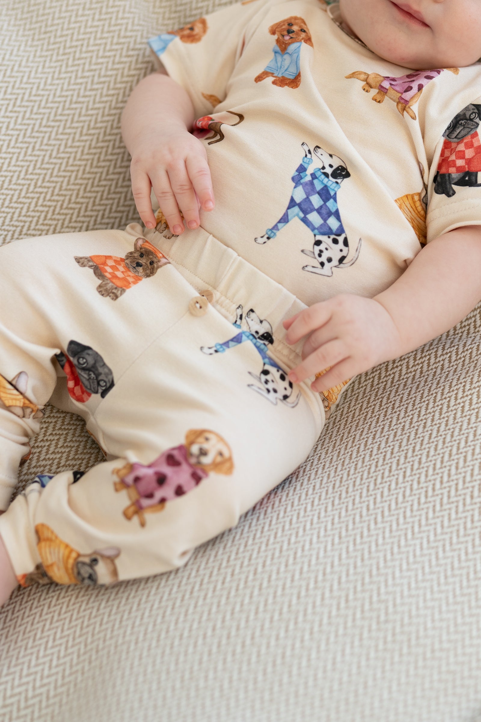 kremowy kolor, wzór piesków, miękka i oddychająca dzianina, zapięcie na napy, idealne na co dzień