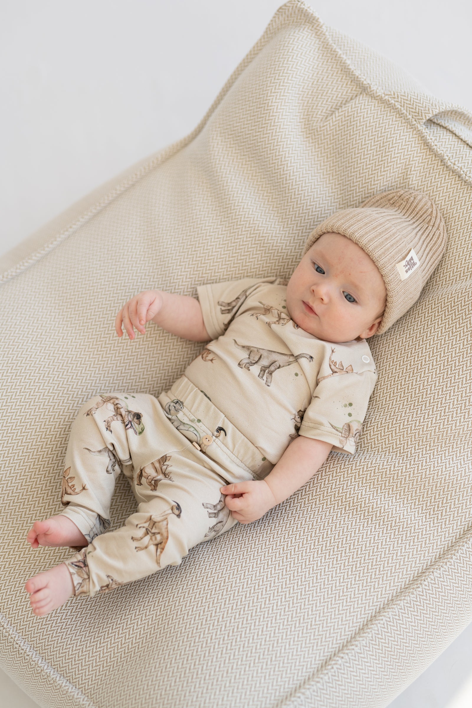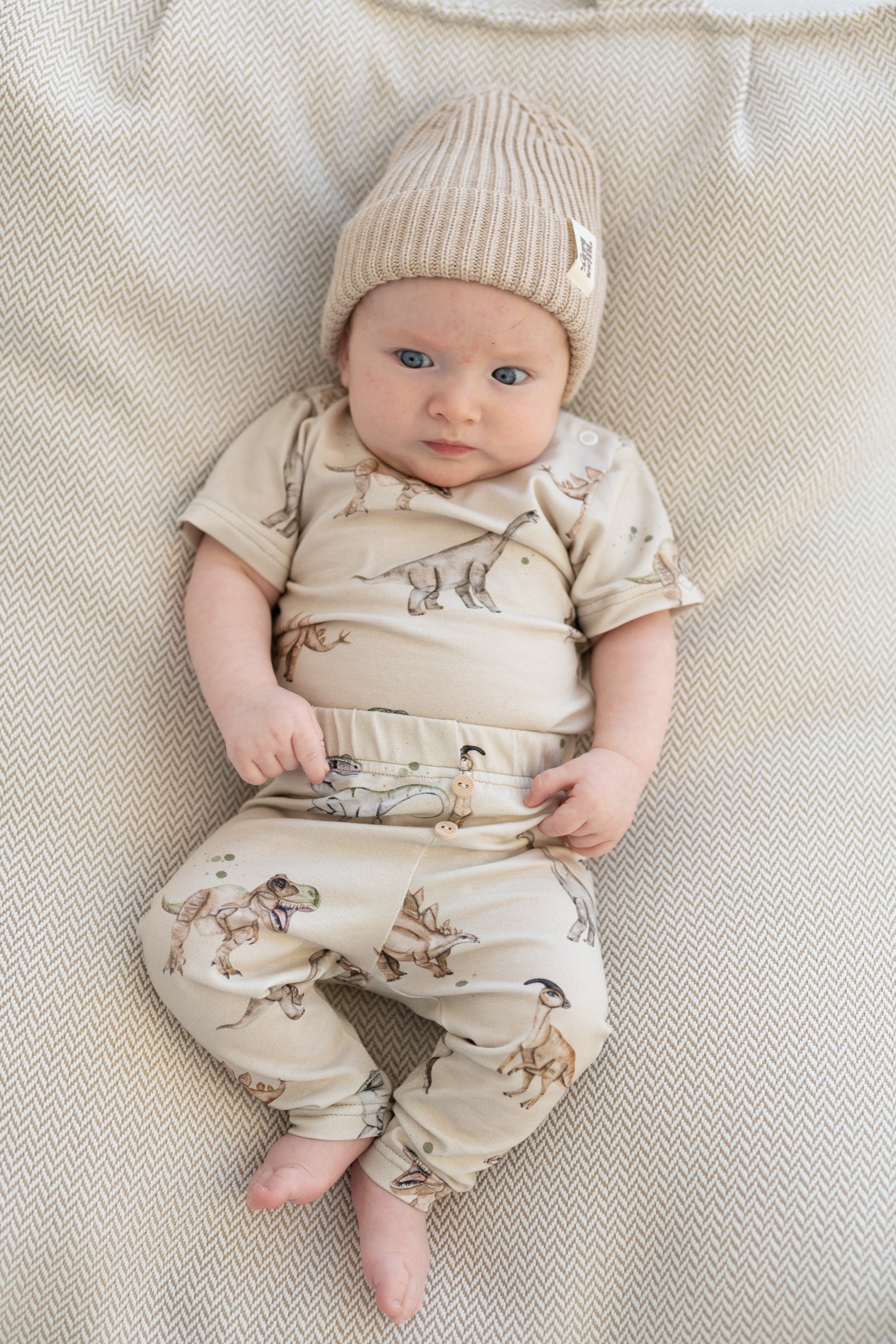 Body niemowlęce w jasnym kolorze z delikatnym wzorem dinozaurów. Uszyte z miękkiej, elastycznej dzianiny, zapewnia wygodę i swobodę ruchów. Praktyczne zapięcie na napy ułatwia codzienne użytkowanie, a minimalistyczny print nadaje całości ponadczasowy charakter.