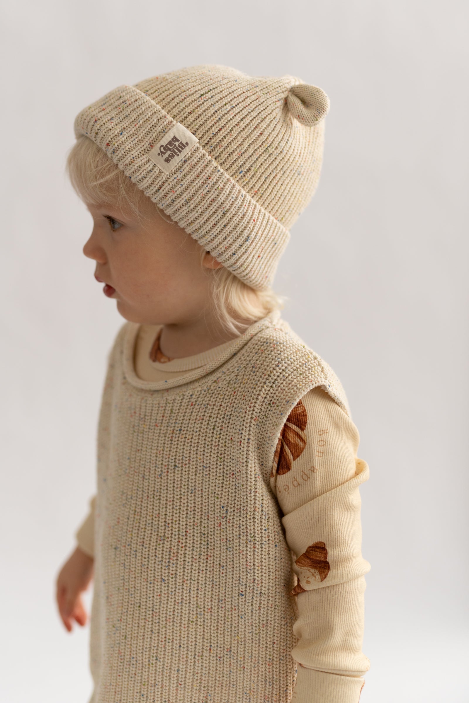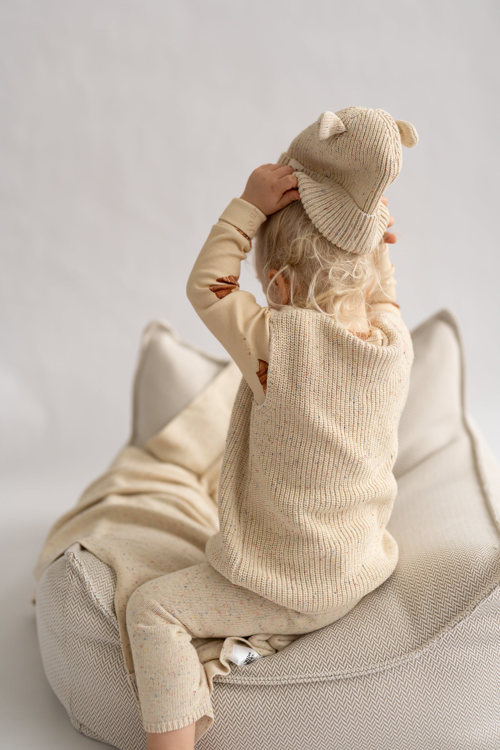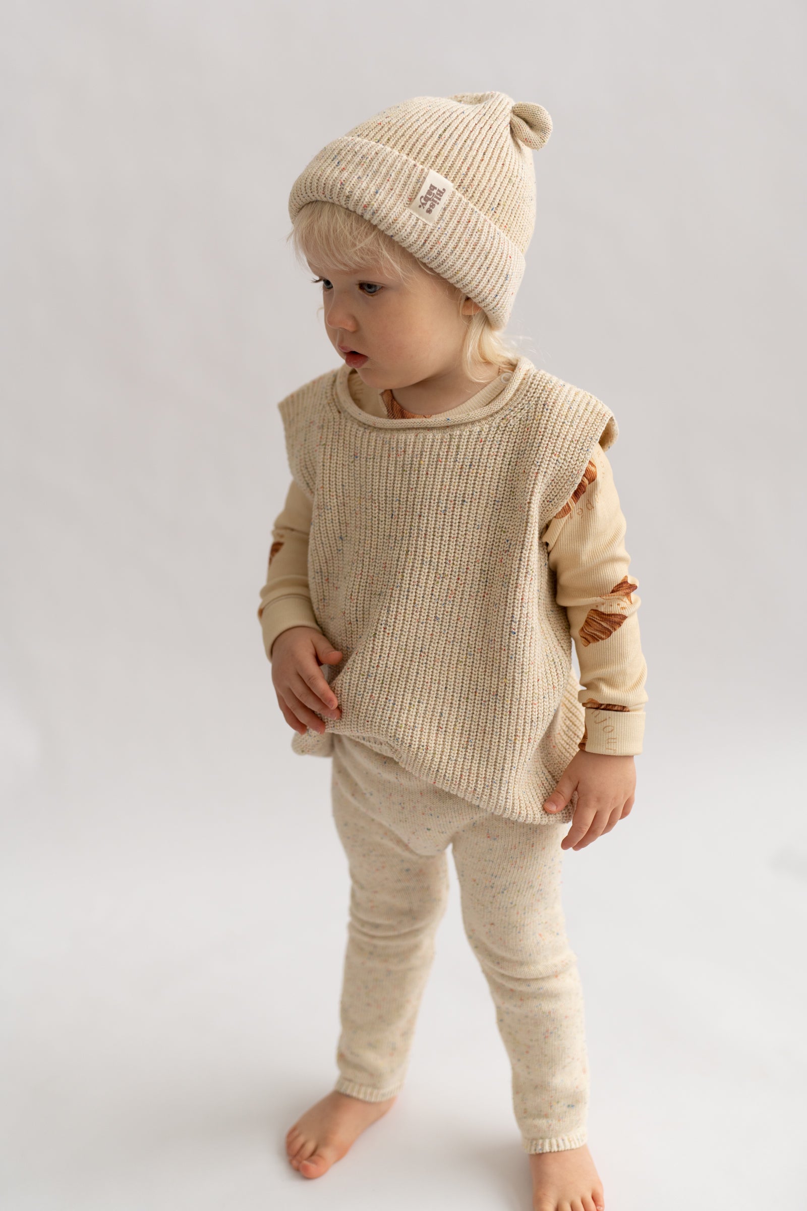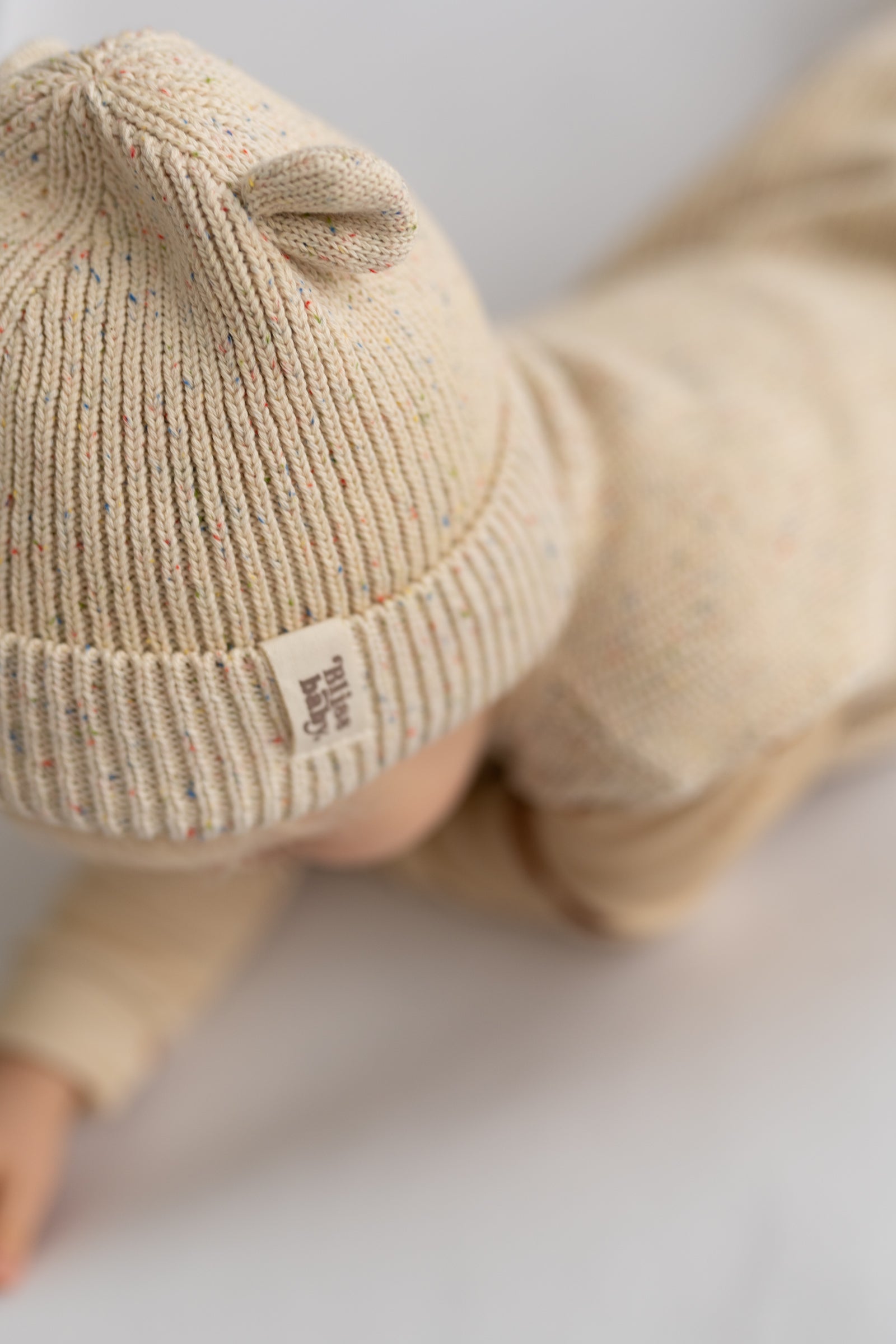 Miękka, prążkowana czapka w naturalnym, kremowym odcieniu, ozdobiona subtelnymi, kolorowymi drobinkami przypominającymi confetti. Wykonana z przyjemnej w dotyku dzianiny, która otula i zapewnia komfort noszenia przez cały dzień. Charakterystyczne, małe „uszka” dodają całości uroku i lekko playful’owego akcentu. Idealna na chłodniejsze dni - minimalistyczna, a jednocześnie wyjątkowa.