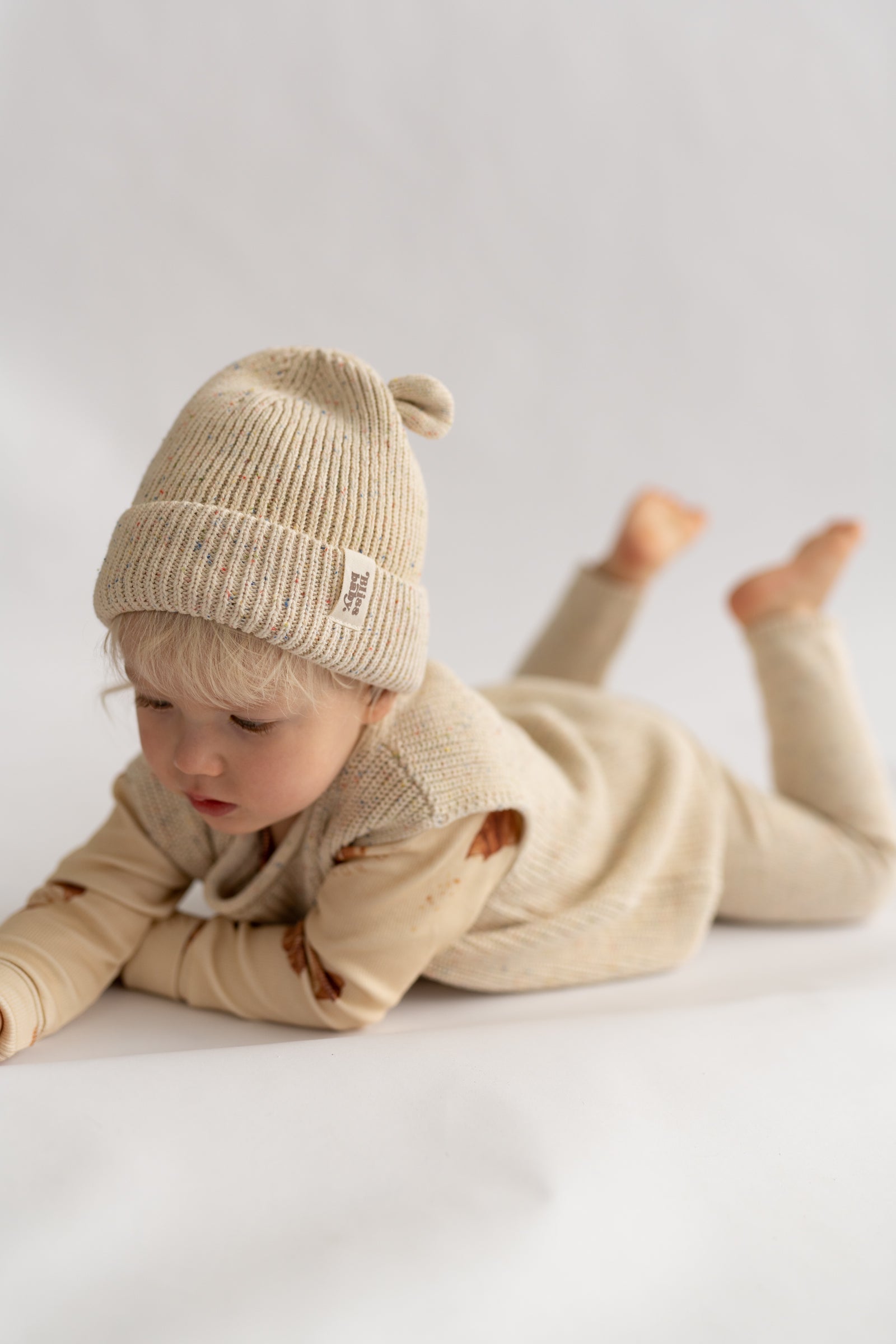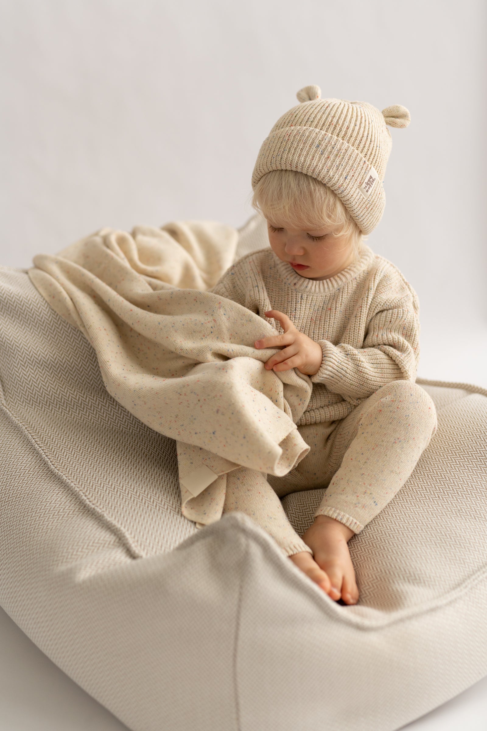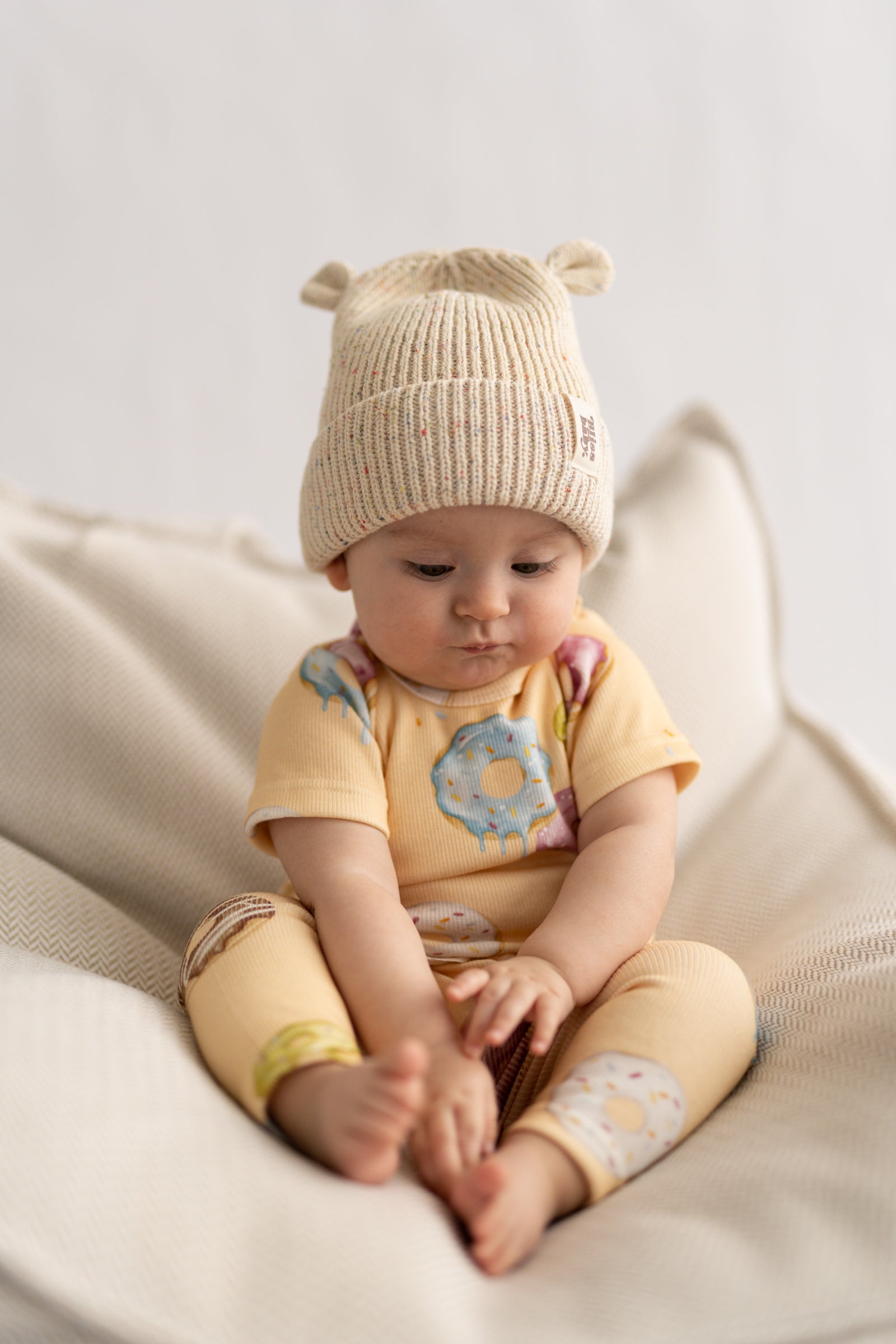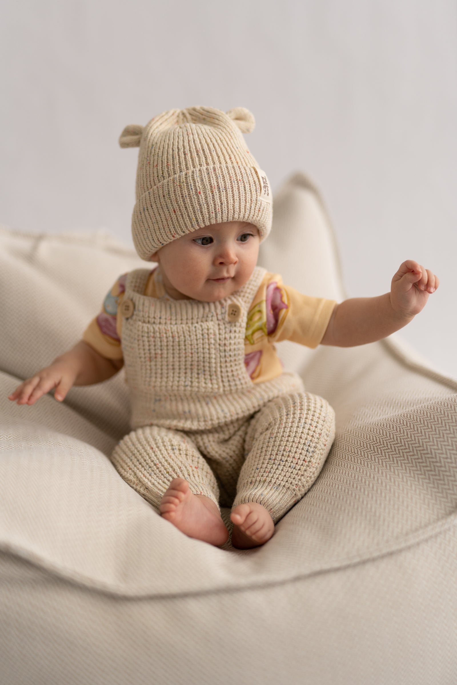 Miękka, prążkowana czapka w naturalnym, kremowym odcieniu, ozdobiona subtelnymi, kolorowymi drobinkami przypominającymi confetti. Wykonana z przyjemnej w dotyku dzianiny, która otula i zapewnia komfort noszenia przez cały dzień. Charakterystyczne, małe „uszka” dodają całości uroku i lekko playful’owego akcentu. Idealna na chłodniejsze dni - minimalistyczna, a jednocześnie wyjątkowa.