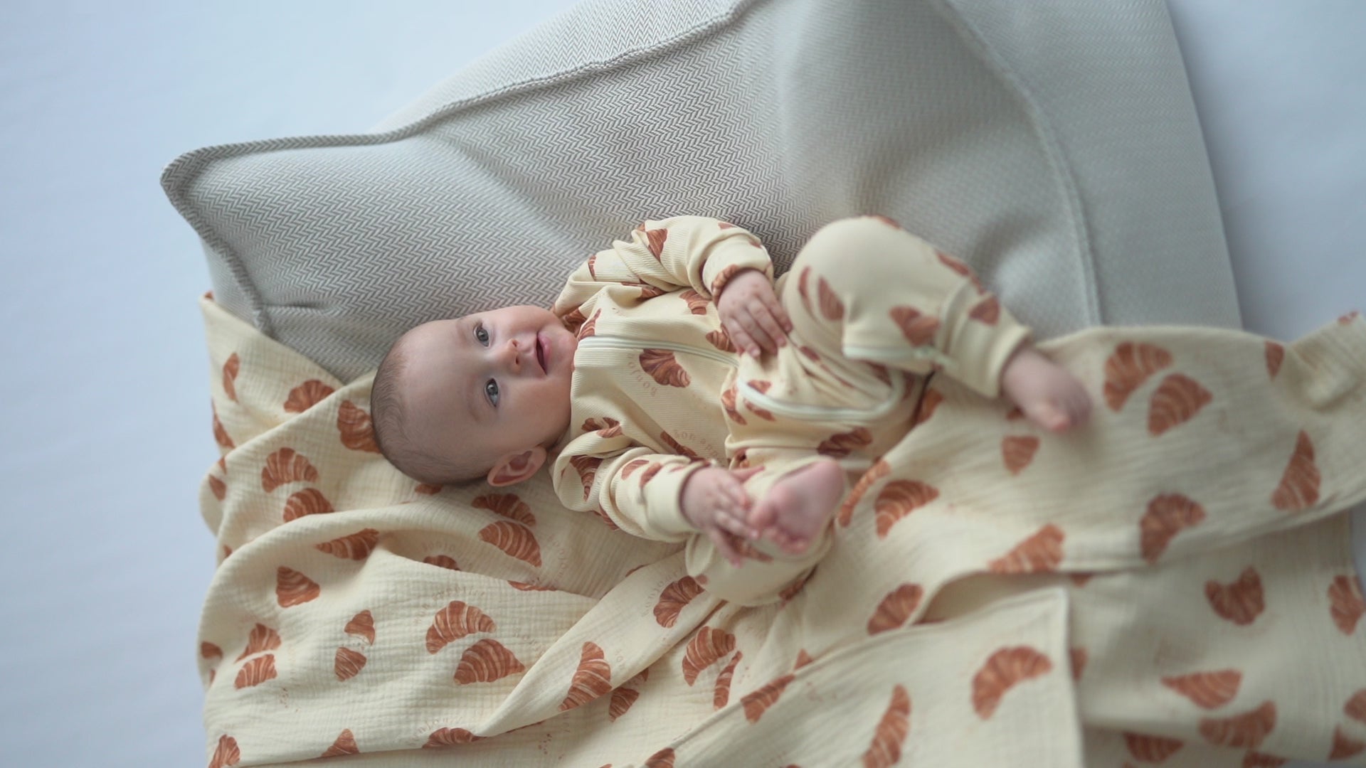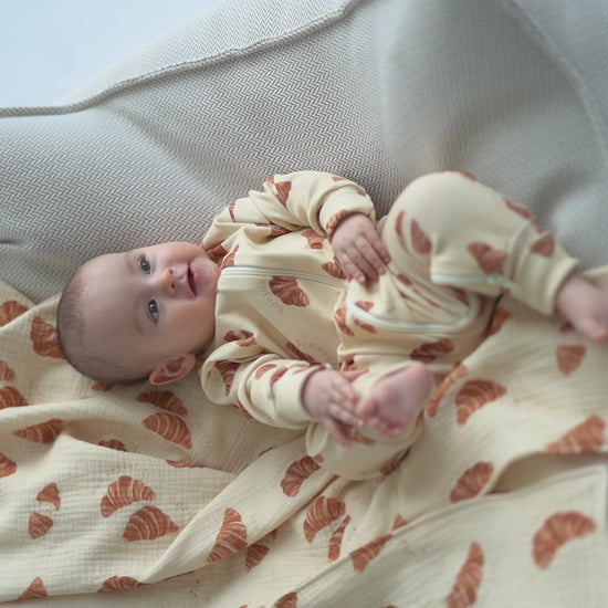 Lekki, miękki otulacz wykonany z oddychającego muślinu w ciepłym, kremowym odcieniu. Subtelny print croissantów nadaje całości paryskiego charakteru i przyjemnie playful’owego akcentu. Naturalna faktura tkaniny sprawia, że otulacz jest idealny do codziennego użytku - do spania, spacerów i delikatnego okrycia. Miękki, naturalny i ponadczasowy dodatek do dziecięcej wyprawki.