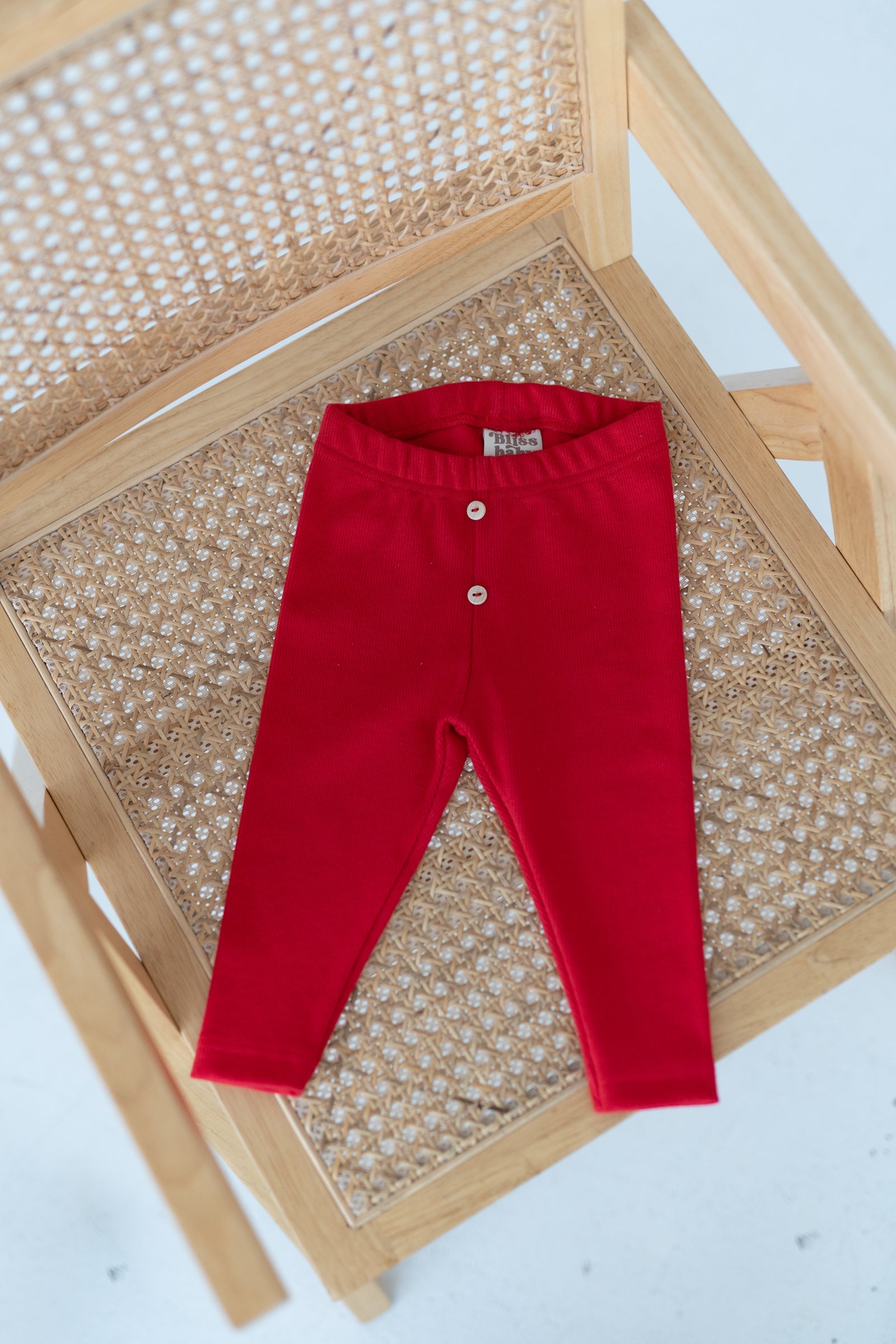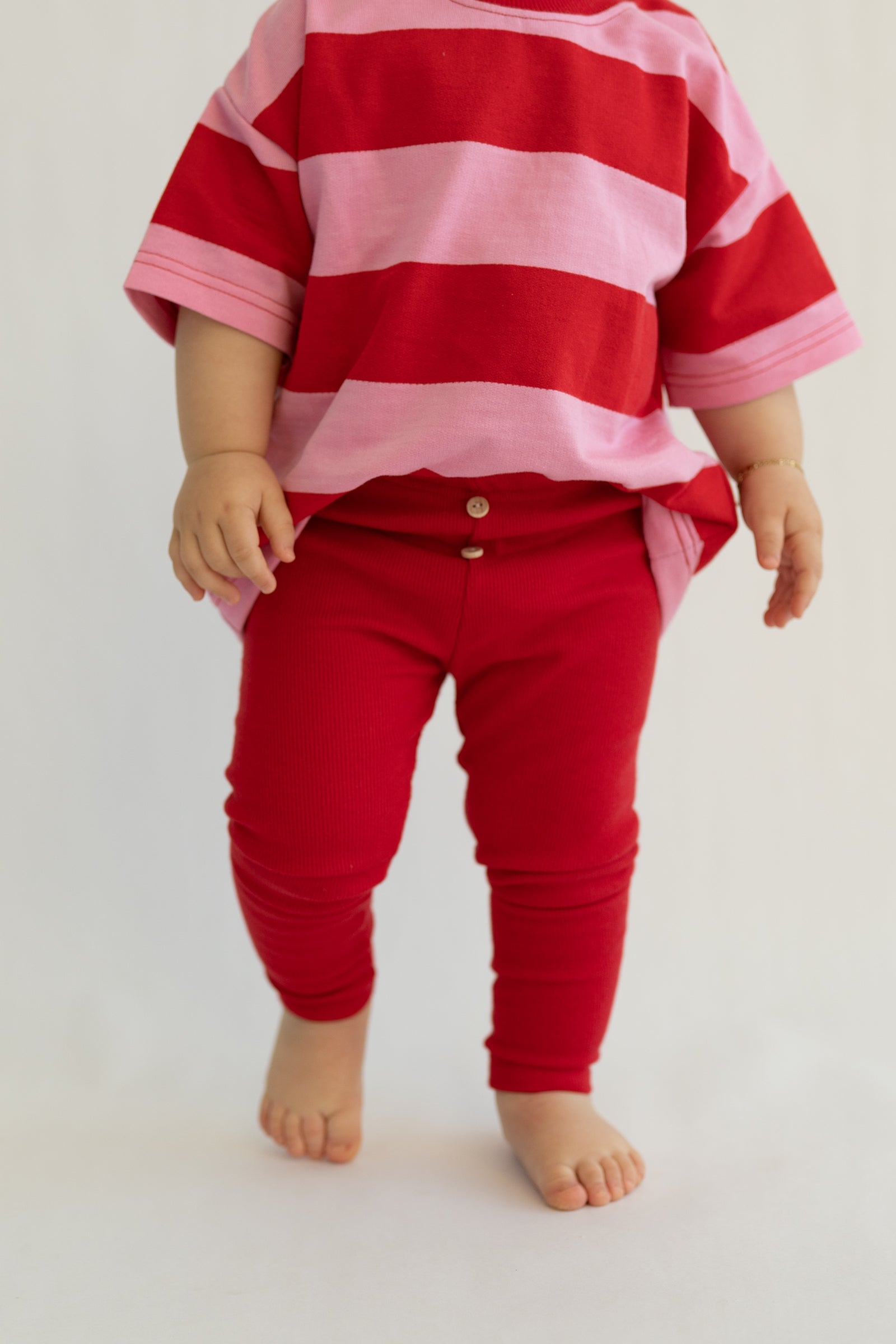 Legginsy dziecięce w intensywnym czerwonym kolorze, wykonane z miękkiej, elastycznej dzianiny o delikatnym prążku. Komfortowy pas z gumką oraz dekoracyjne guziki zapewniają wygodę noszenia i łatwe dopasowanie. Klasyczny, dopasowany krój sprawia, że legginsy idealnie sprawdzą się zarówno na co dzień, jak i jako baza wielu stylizacji.