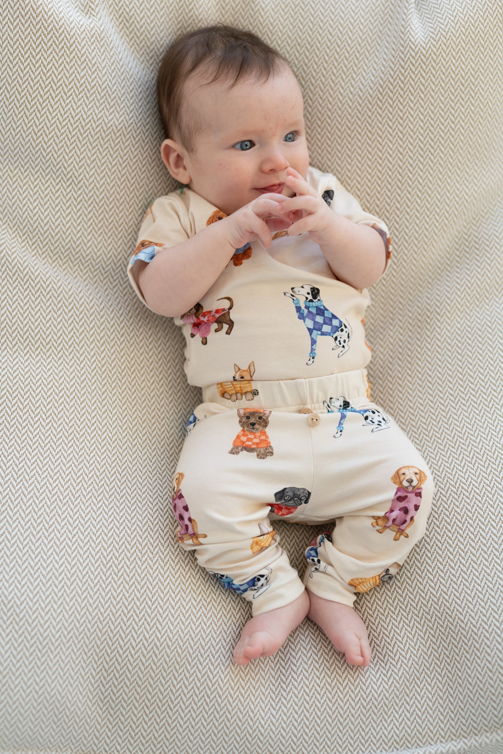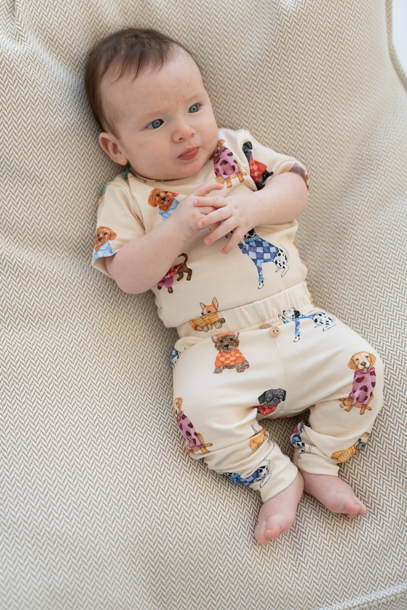 kremowy kolor, wzór piesków, elastyczny pas z guzikami, miękka i przyjemna w dotyku dzianina, idealne na co dzień