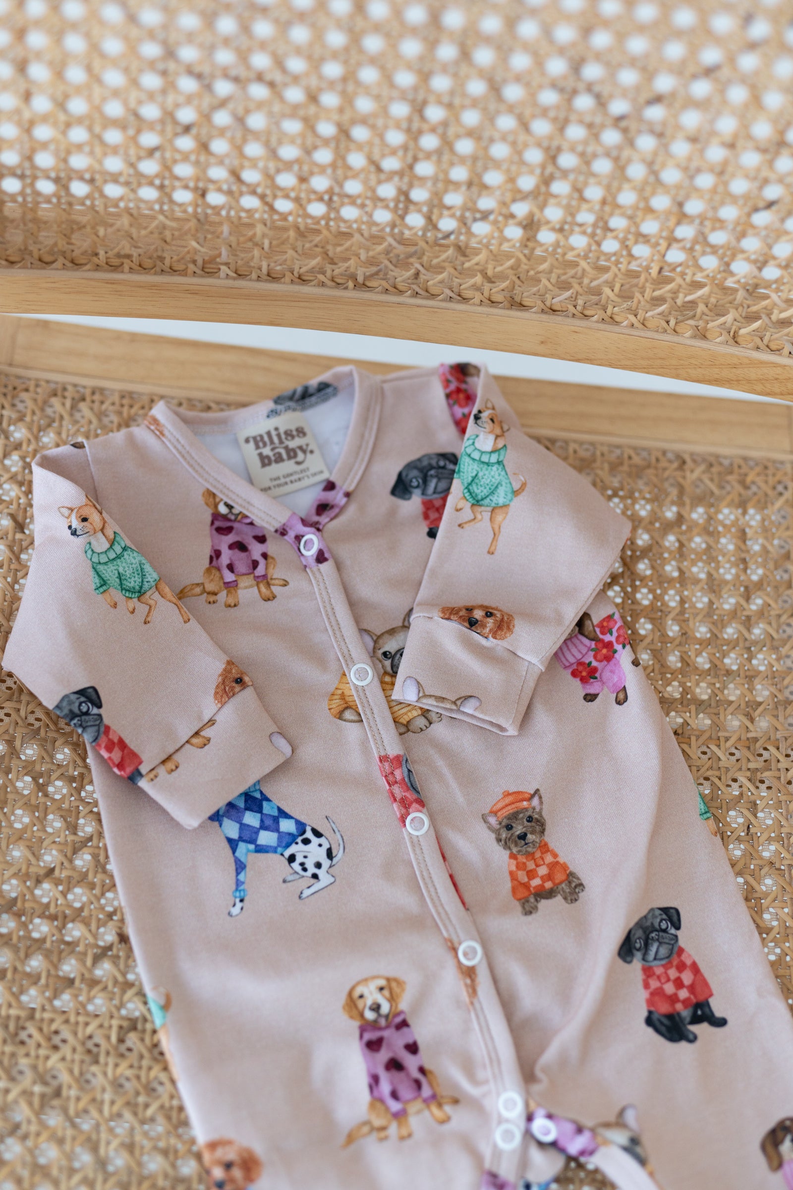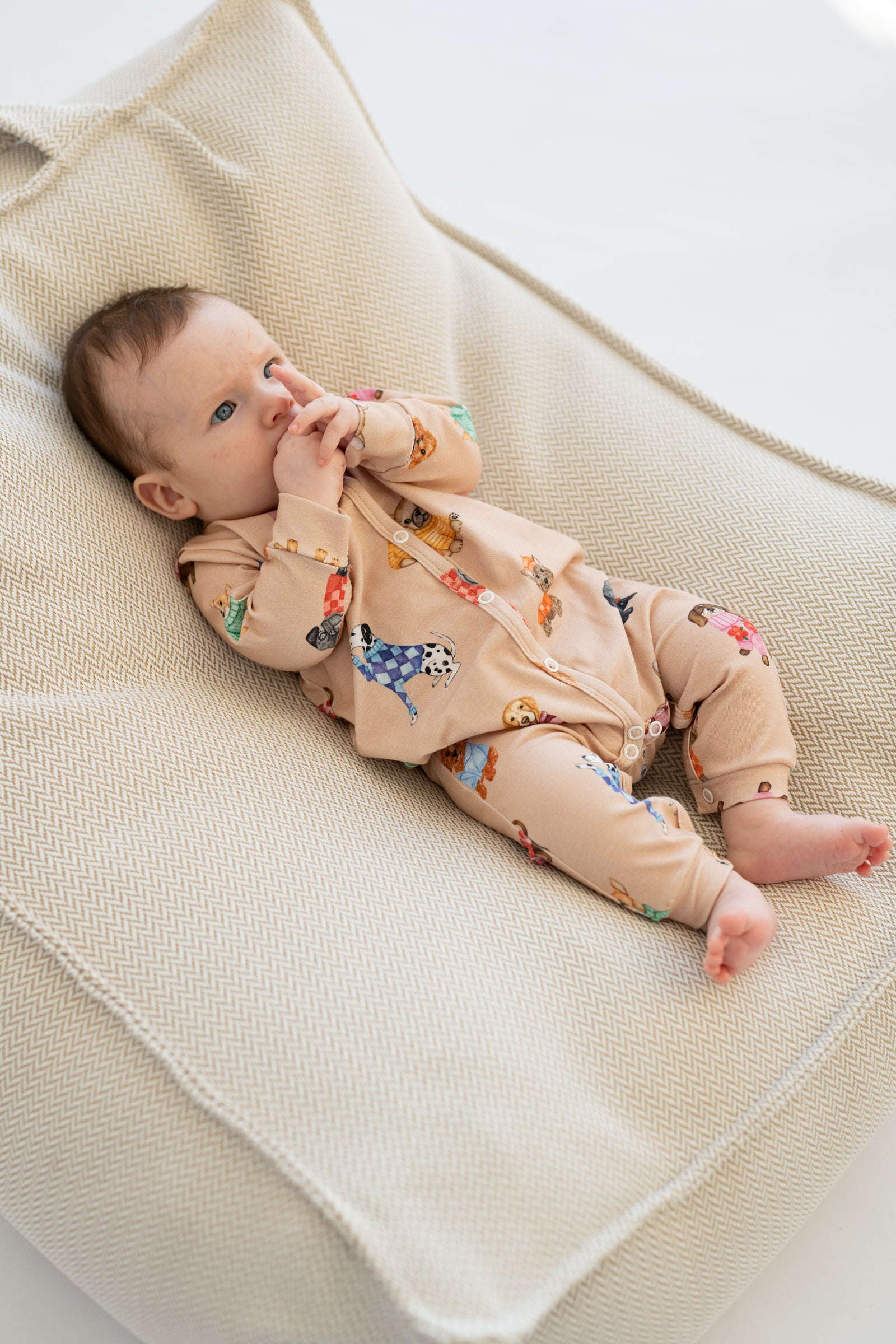 Romper niemowlęcy w beżowej, neutralnej kolorystyce z subtelnym wzorem piesków. Wykonany z miękkiej, oddychającej dzianiny, zapewnia komfort noszenia i swobodę ruchów przez cały dzień. Praktyczne zapięcie na napy na całej długości ułatwia zakładanie, przebieranie oraz zmianę pieluszki. Stonowana paleta kolorów sprawia, że romper doskonale wpisuje się w minimalistyczną garderobę niemowlęcą.