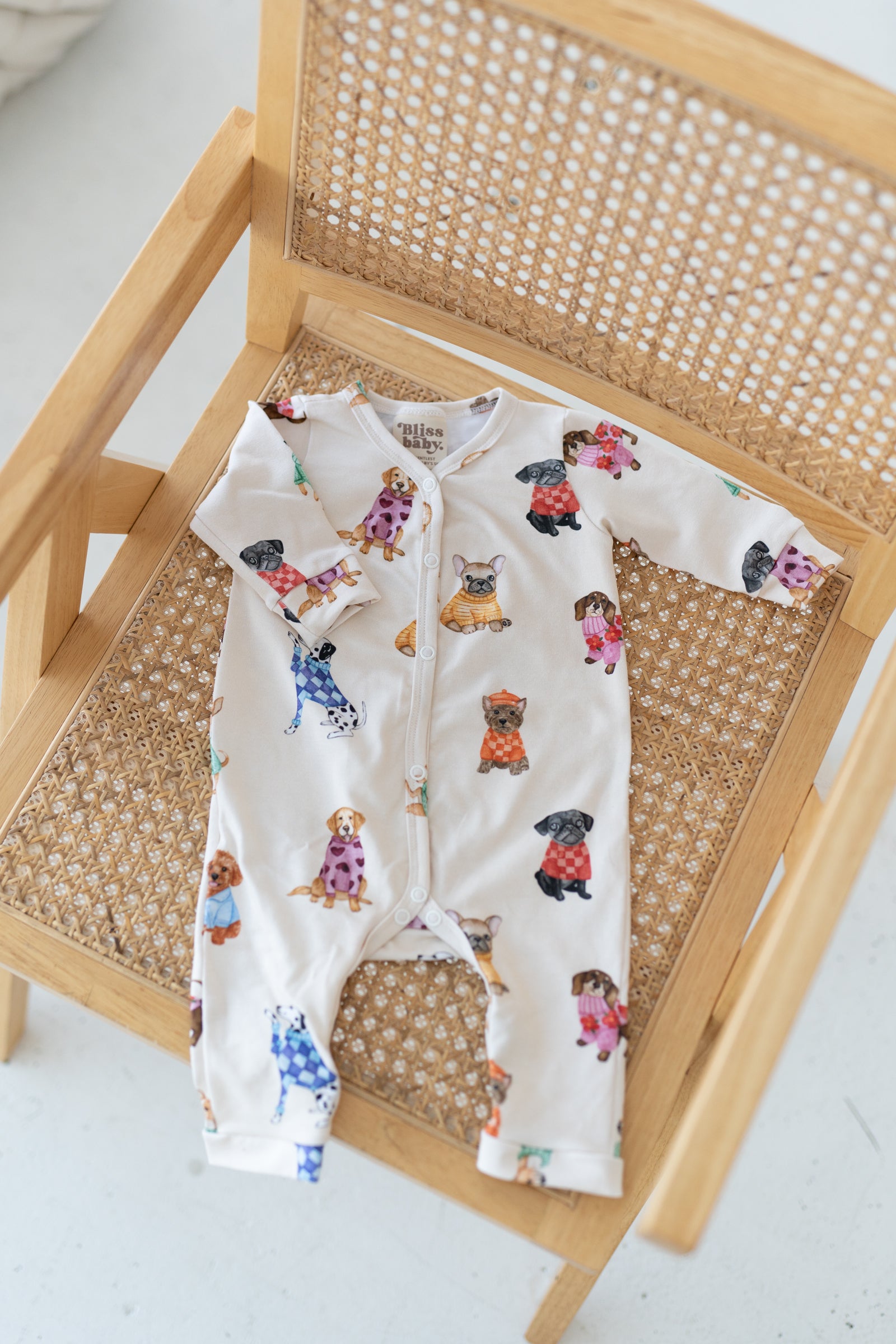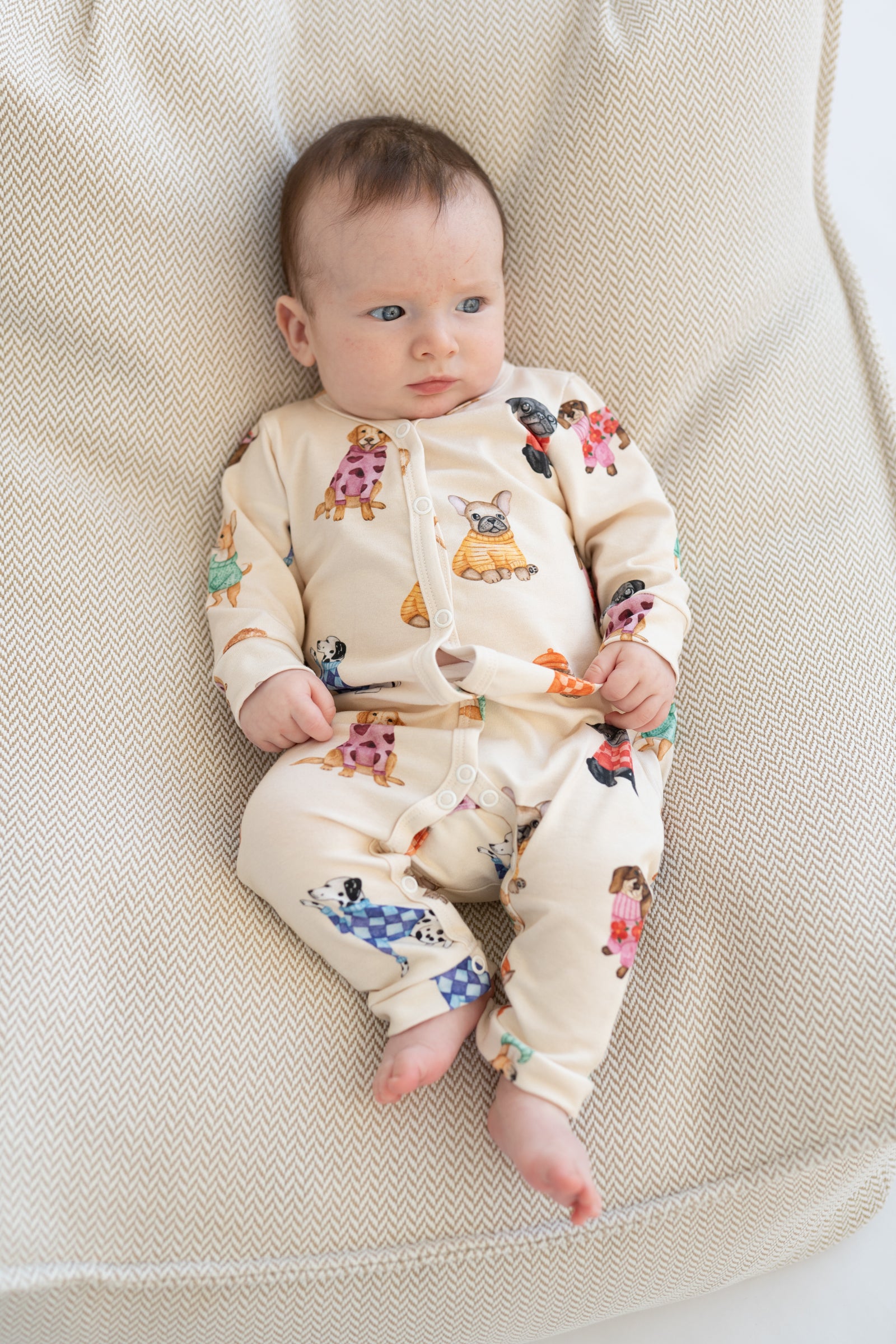Romper niemowlęcy w kremowej kolorystyce z delikatnym wzorem piesków. Wykonany z miękkiej, oddychającej dzianiny, zapewnia komfort noszenia i swobodę ruchów przez cały dzień. Praktyczne zapięcie na napy na całej długości ułatwia zakładanie, przebieranie oraz zmianę pieluszki. Jasna, neutralna baza i subtelny print sprawiają, że romper jest uniwersalnym elementem codziennej garderoby niemowlęcej.