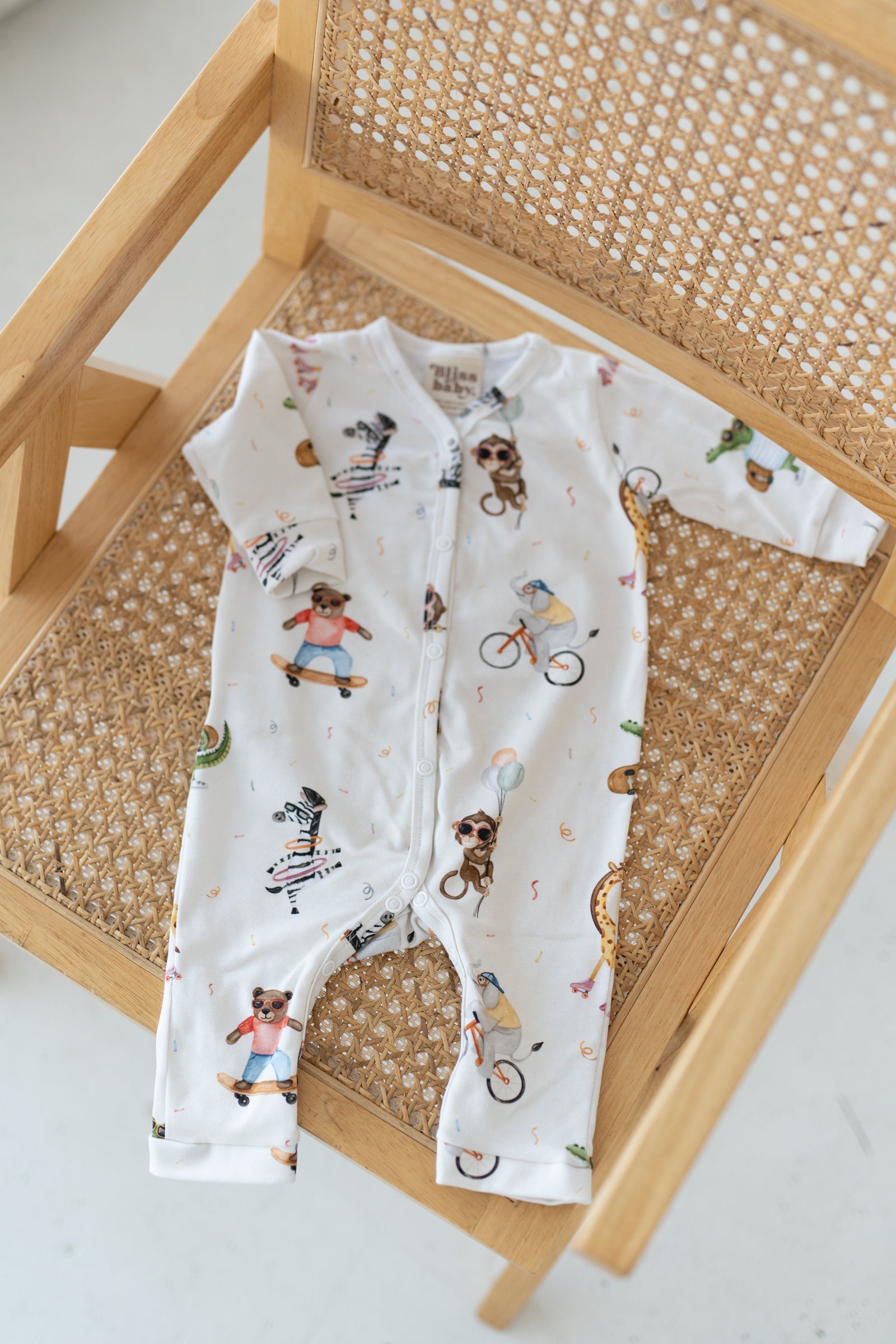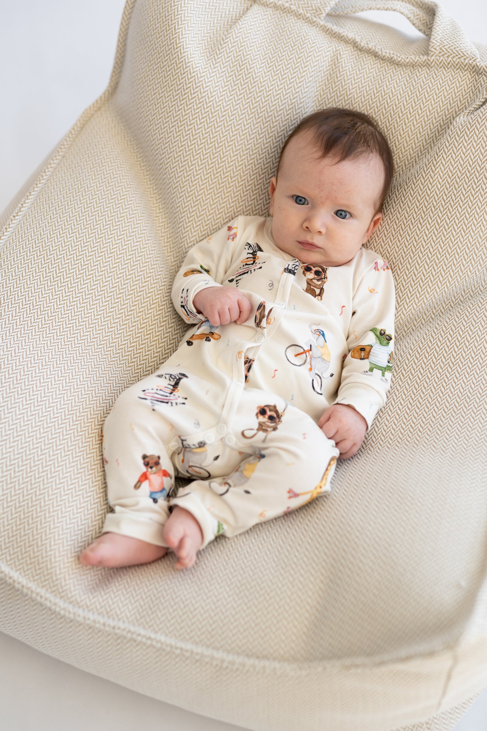 Romper niemowlęcy w jasnej, neutralnej kolorystyce z dynamicznym wzorem zwierzaków. Wykonany z miękkiej, oddychającej dzianiny, zapewnia komfort noszenia i swobodę ruchów przez cały dzień. Praktyczne zapięcie na napy na całej długości ułatwia zakładanie, przebieranie oraz zmianę pieluszki. Idealny zarówno do noszenia w domu, jak i na spacer.