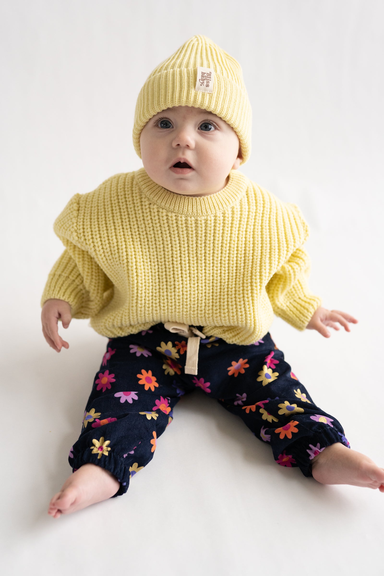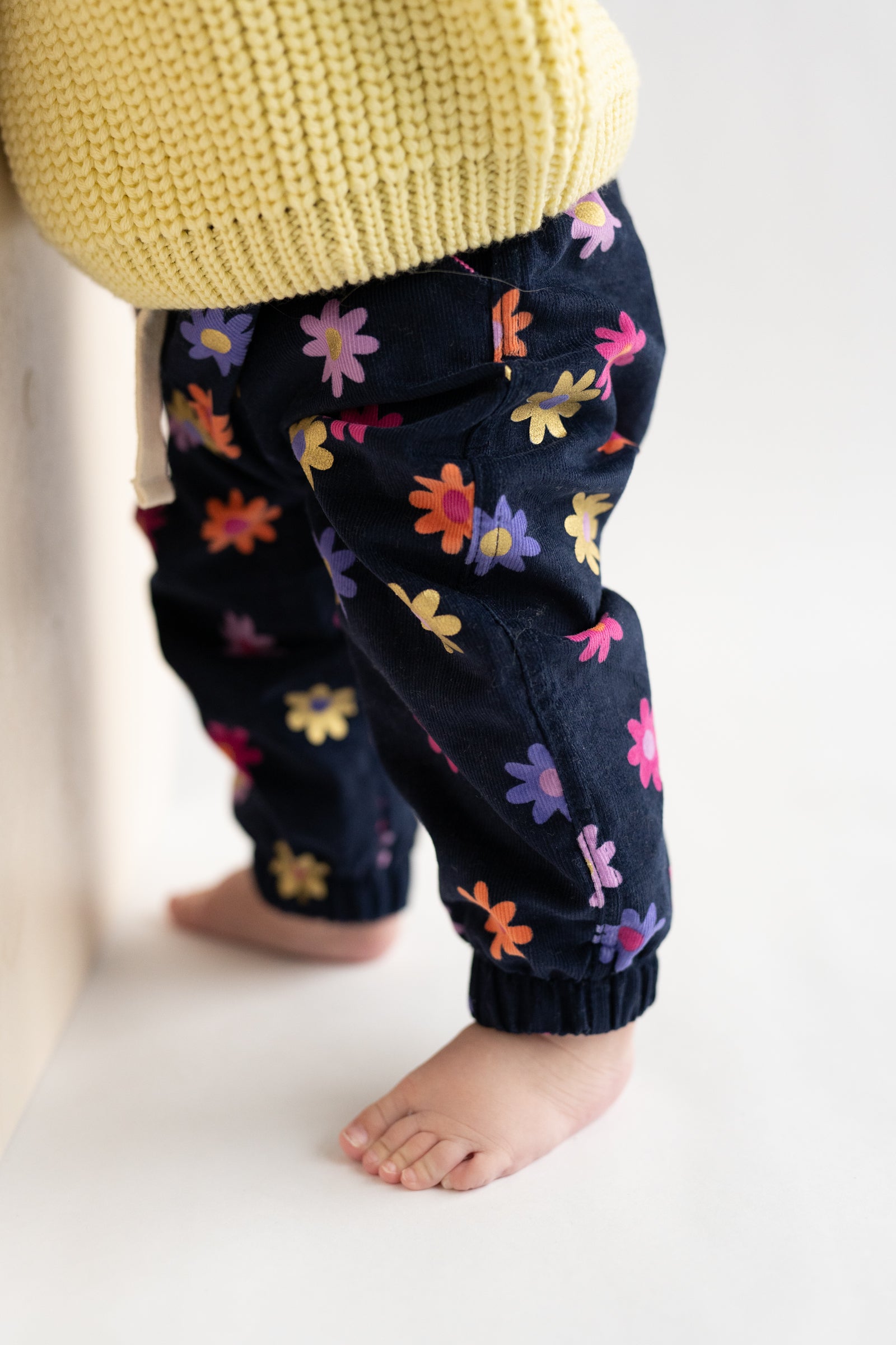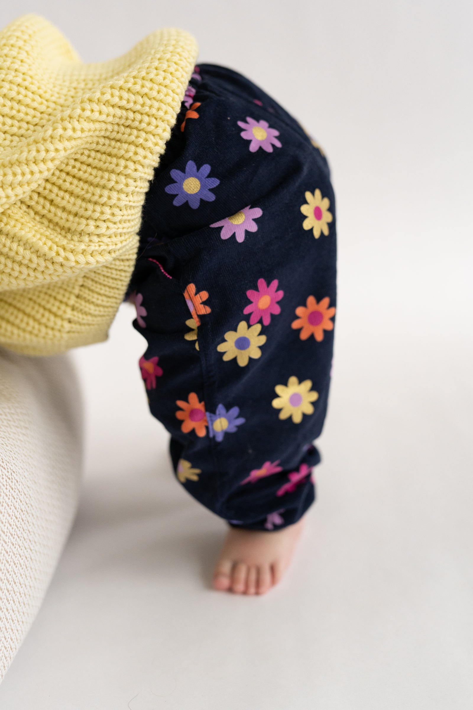 Spodnie Nori to małe dzieło sztuki w dziecięcej garderobie — intensywny granat sztruksu połączony z energetycznymi, ręcznie malowanymi kwiatami tworzy wyjątkowy, radosny wzór, który od razu przyciąga spojrzenia.