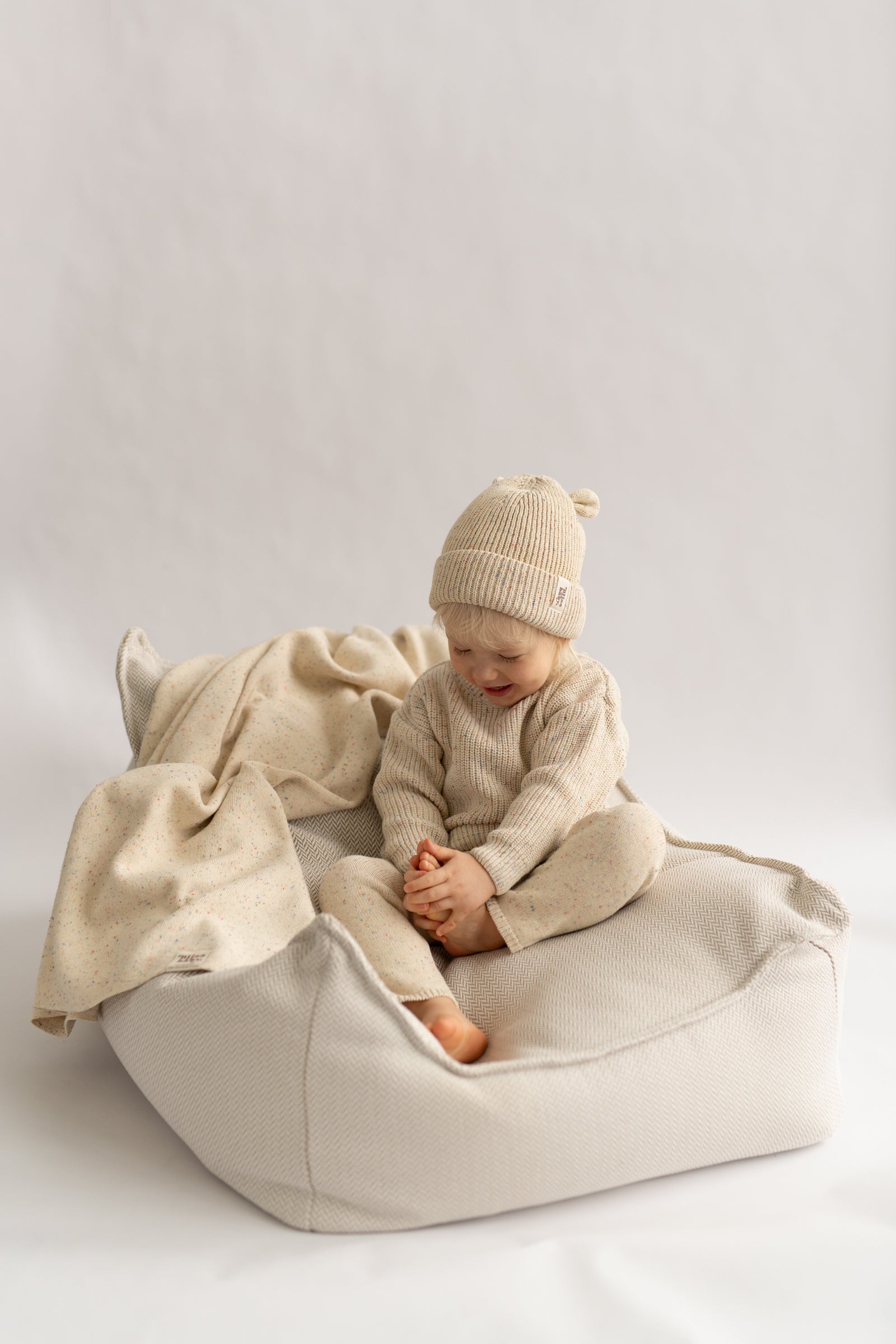 Miękkie, dzianinowe ogrodniczki w naturalnym, kremowym odcieniu, ozdobione subtelnymi, kolorowymi drobinkami przypominającymi delikatne confetti. Wykonane z przyjemnej w dotyku, oddychającej dzianiny, zapewniają komfort i swobodę ruchów od pierwszych dni. Klasyczny krój z regulowanymi szelkami zapinanymi na guziki ułatwia zakładanie i dopasowanie. Ponadczasowa forma połączona z miękką fakturą sprawia, że to idealna baza do codziennych stylizacji. Funkcja rosnąca dzięki przepinaniu guzików.