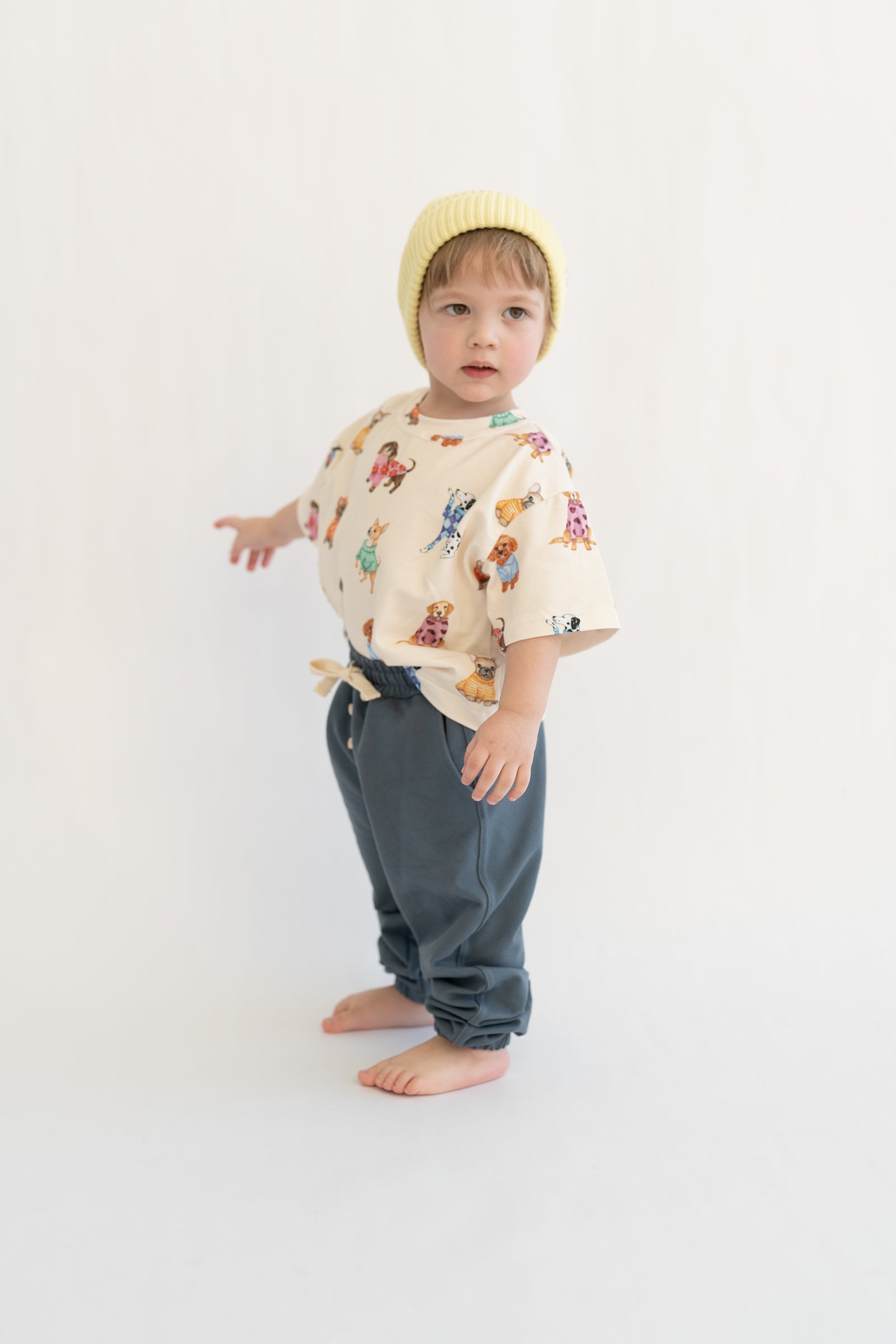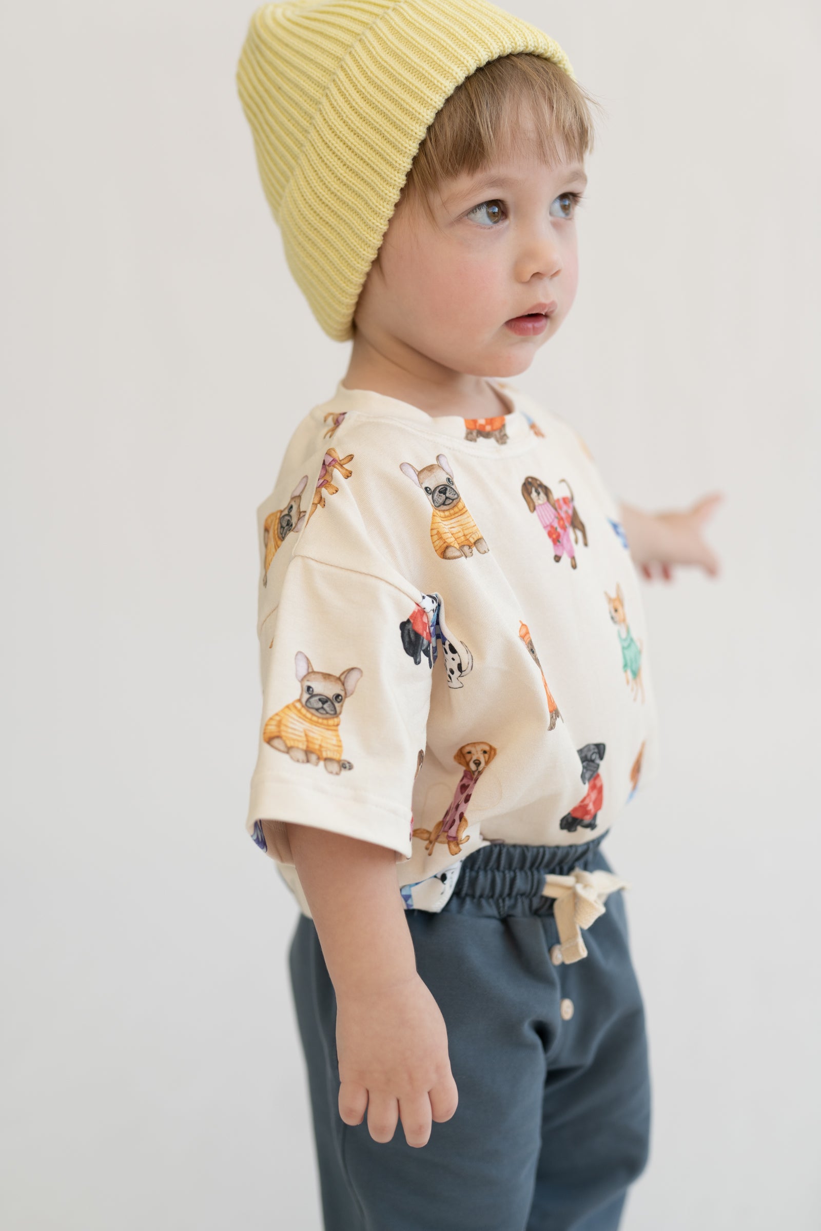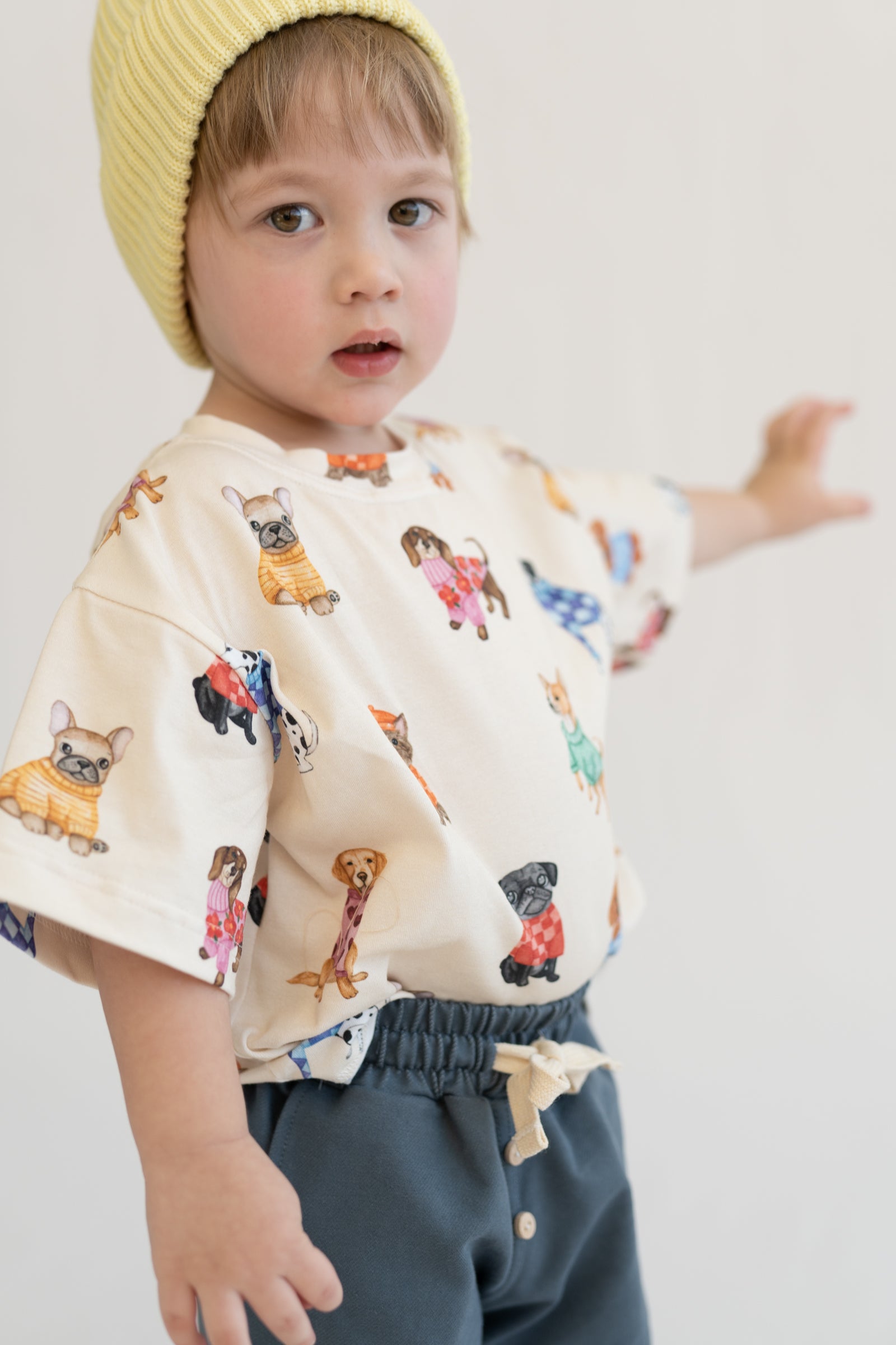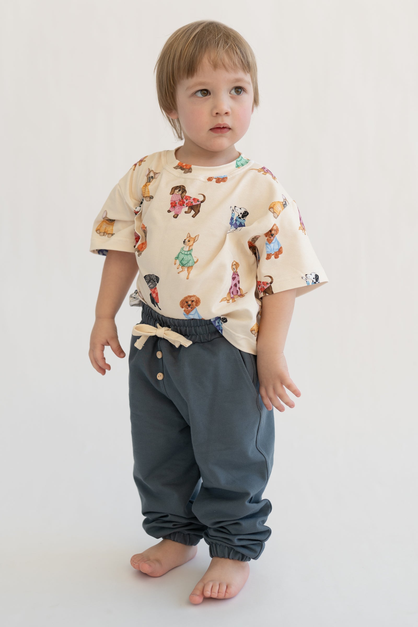 Bluzka dziecięca w kremowym kolorze z delikatnym wzorem piesków. Wykonana z miękkiej, oddychającej dzianiny, zapewnia komfort noszenia przez cały dzień. Neutralna kolorystyka sprawia, że łatwo dopasować ją do innych elementów garderoby. Klasyczny krój nie krępuje ruchów i sprawdzi się zarówno na co dzień, jak i na wyjątkowe okazje.