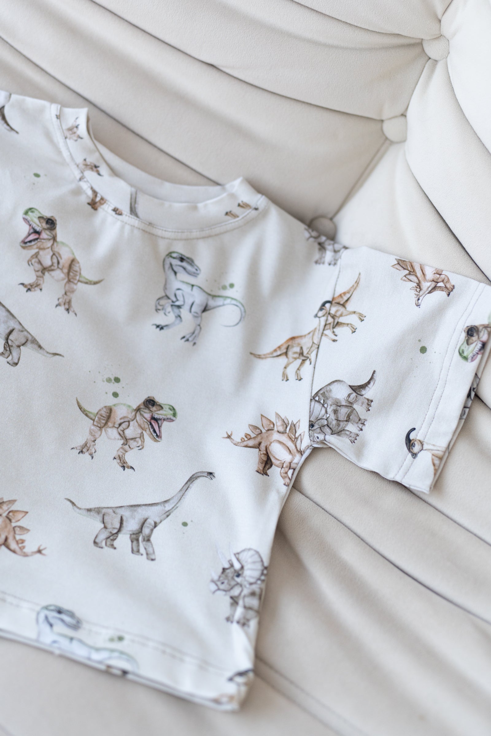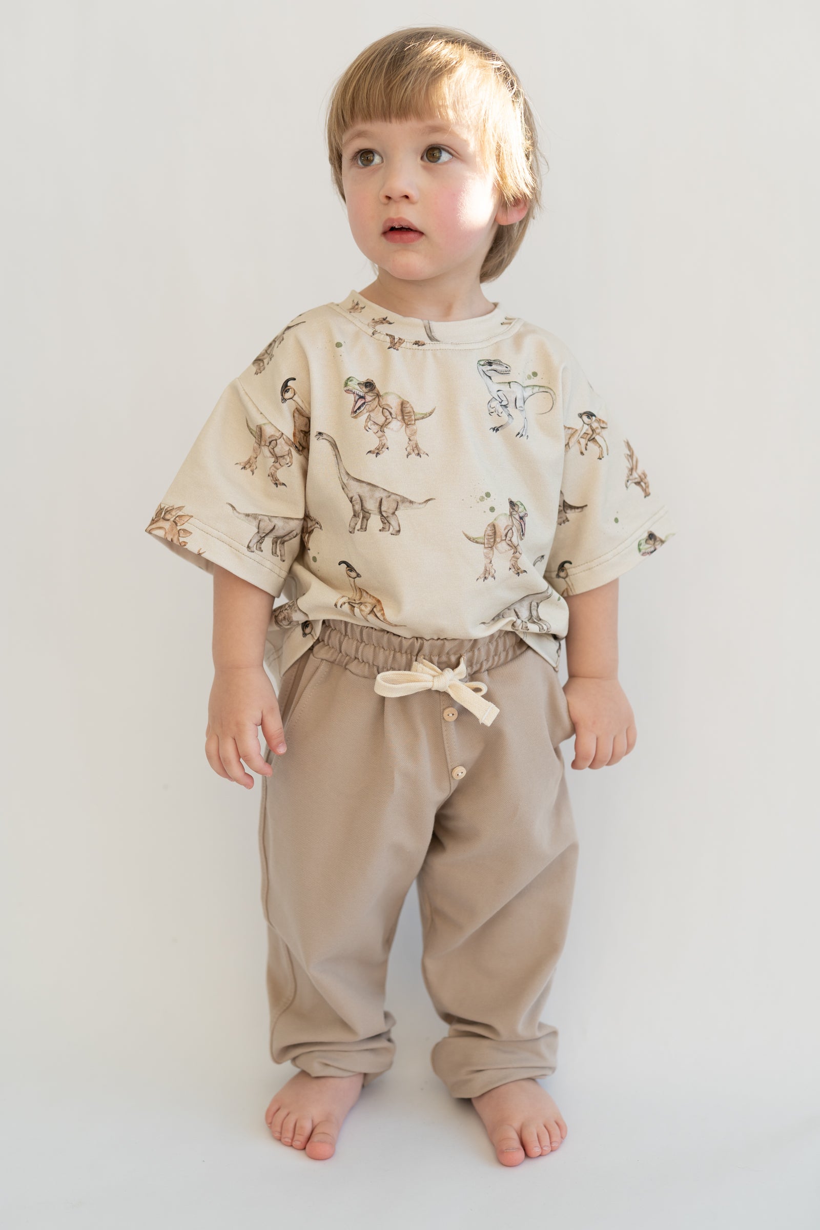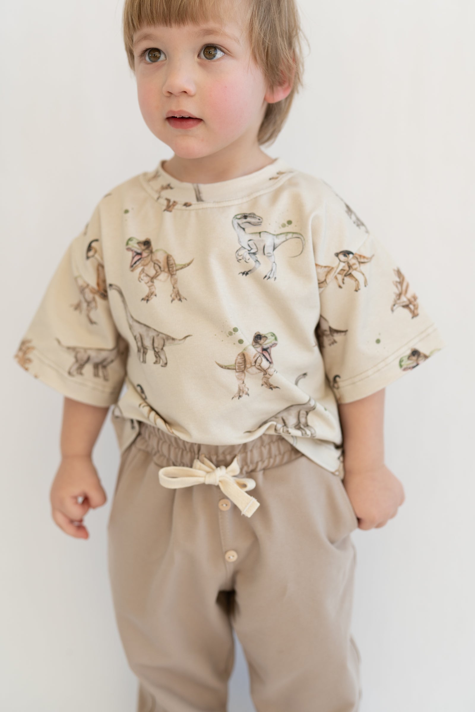 Bluzka dziecięca w jasnym kolorze z delikatnym wzorem dinozaurów. Wykonana z miękkiej, oddychającej dzianiny, zapewnia wygodę noszenia przez cały dzień. Subtelna kolorystyka i minimalistyczny print sprawiają, że model pasuje zarówno do codziennych, jak i bardziej dopracowanych stylizacji. Klasyczny krój gwarantuje swobodę ruchów podczas zabawy.
