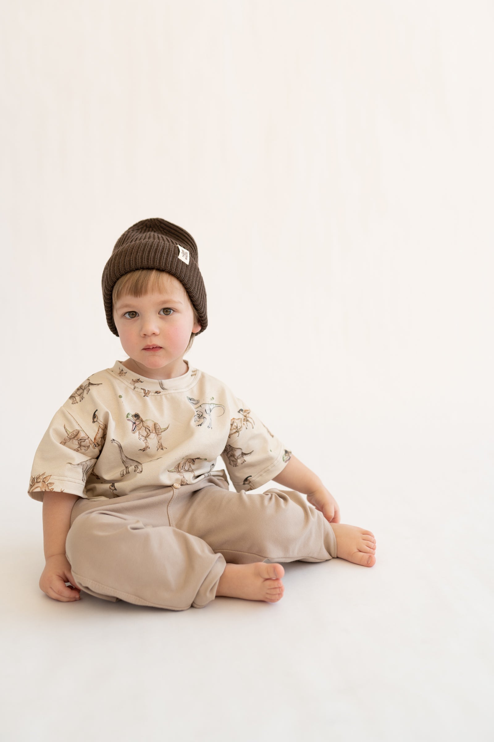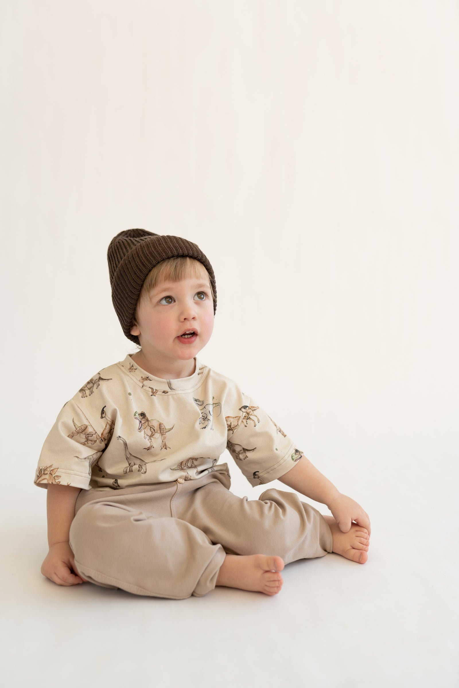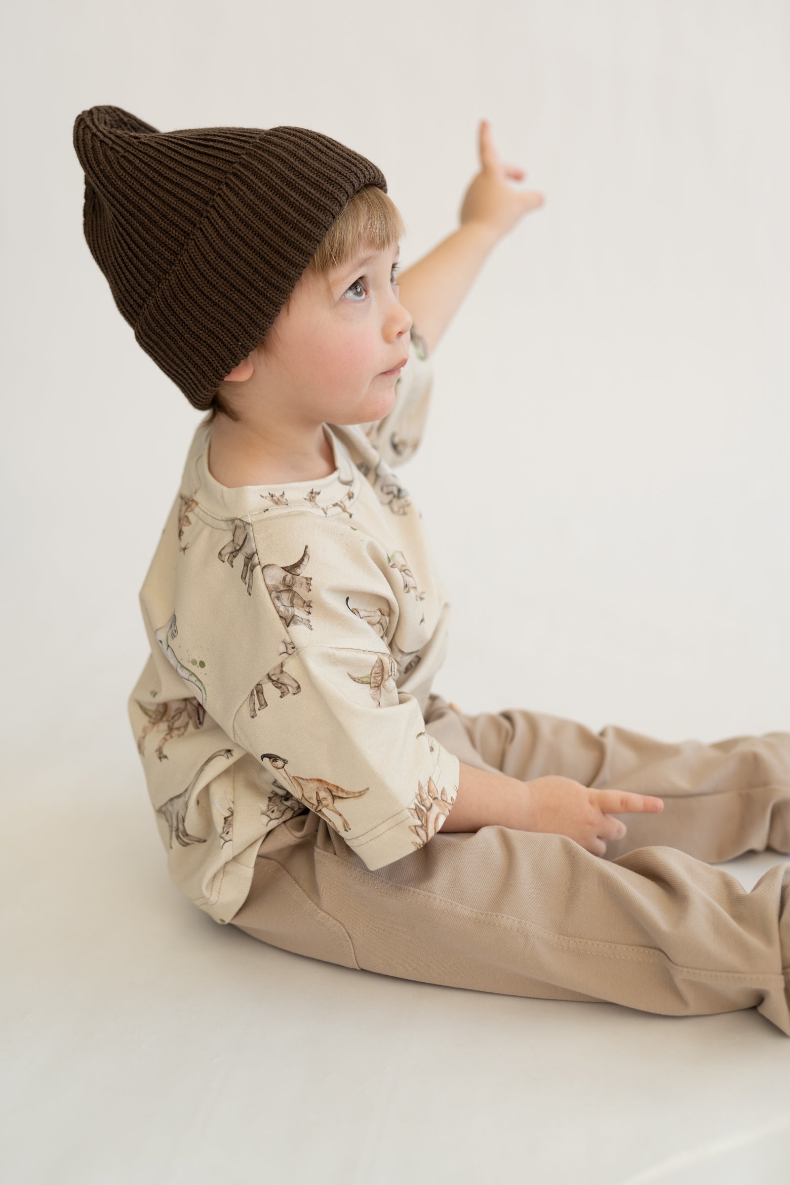 Bluzka dziecięca w jasnym kolorze z delikatnym wzorem dinozaurów. Wykonana z miękkiej, oddychającej dzianiny, zapewnia wygodę noszenia przez cały dzień. Subtelna kolorystyka i minimalistyczny print sprawiają, że model pasuje zarówno do codziennych, jak i bardziej dopracowanych stylizacji. Klasyczny krój gwarantuje swobodę ruchów podczas zabawy.