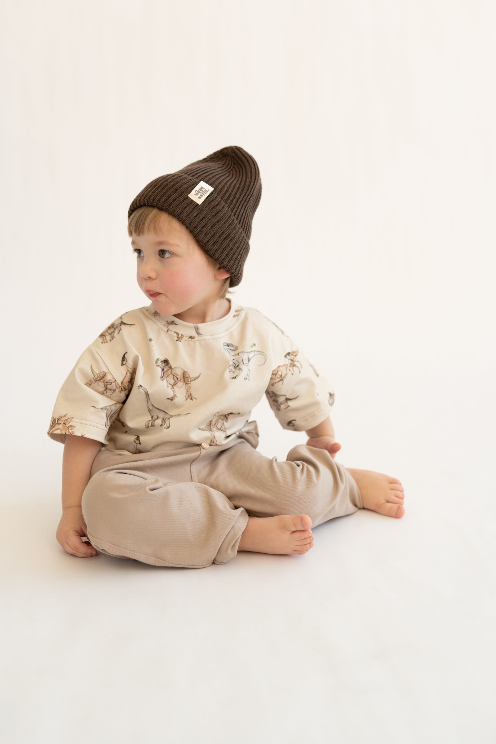 jasny kolor, delikatny wzór dinozaurów, miękka, przyjemna w dotyku dzianina, komfortowy, klasyczny krój, idealna na co dzień